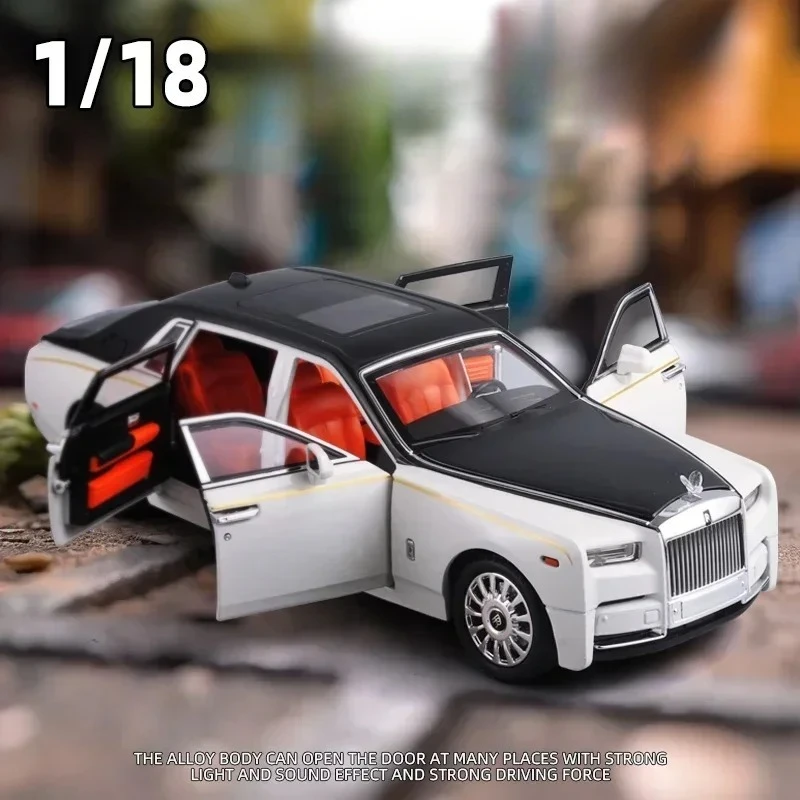 This 1:18 scale diecast model of a Rolls Royce Phantom features an elegant two-tone design, predominantly white with a glossy black hood. Crafted from alloy, it showcases a chrome-finished front grille with intricate detailing and realistic headlights with a jewel-like effect. The model is equipped with simulated sound and light functions, enhancing its appeal as a collectible. Clear windows reveal rich tan upholstery inside, while sleek, glossy black accents on the roof complement the upscale aesthetic. Available color options include white, silvery, and black, with choices of box inclusion for added presentation. Battery-operated, this model is perfect for enthusiasts.