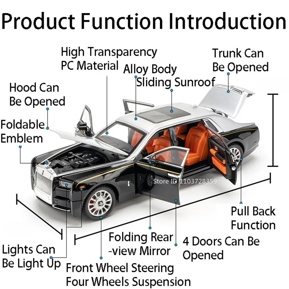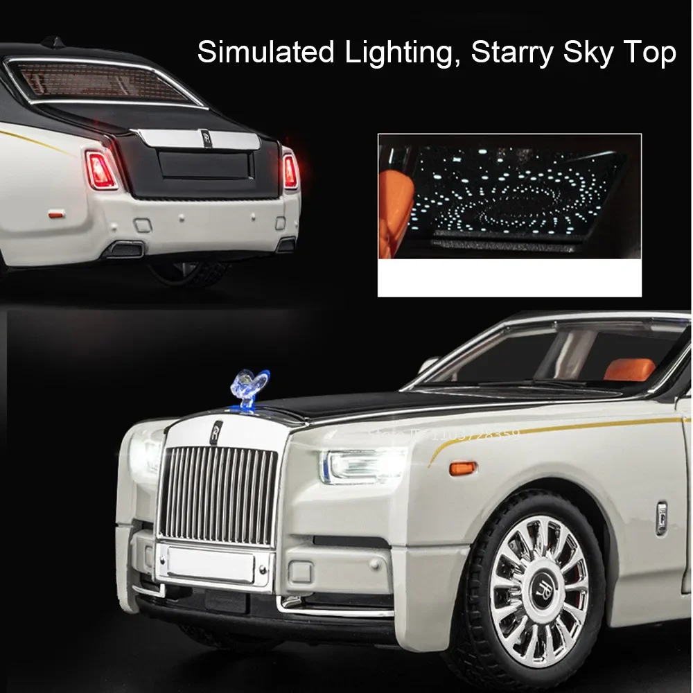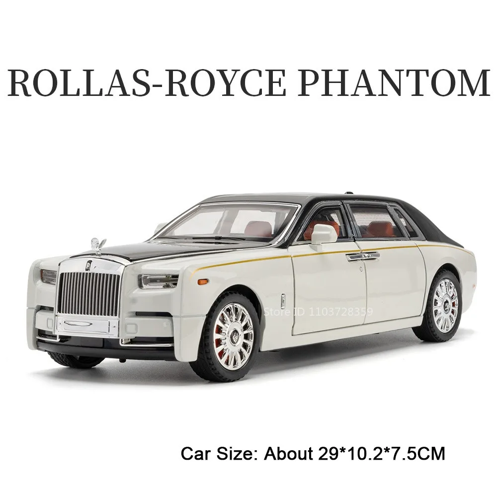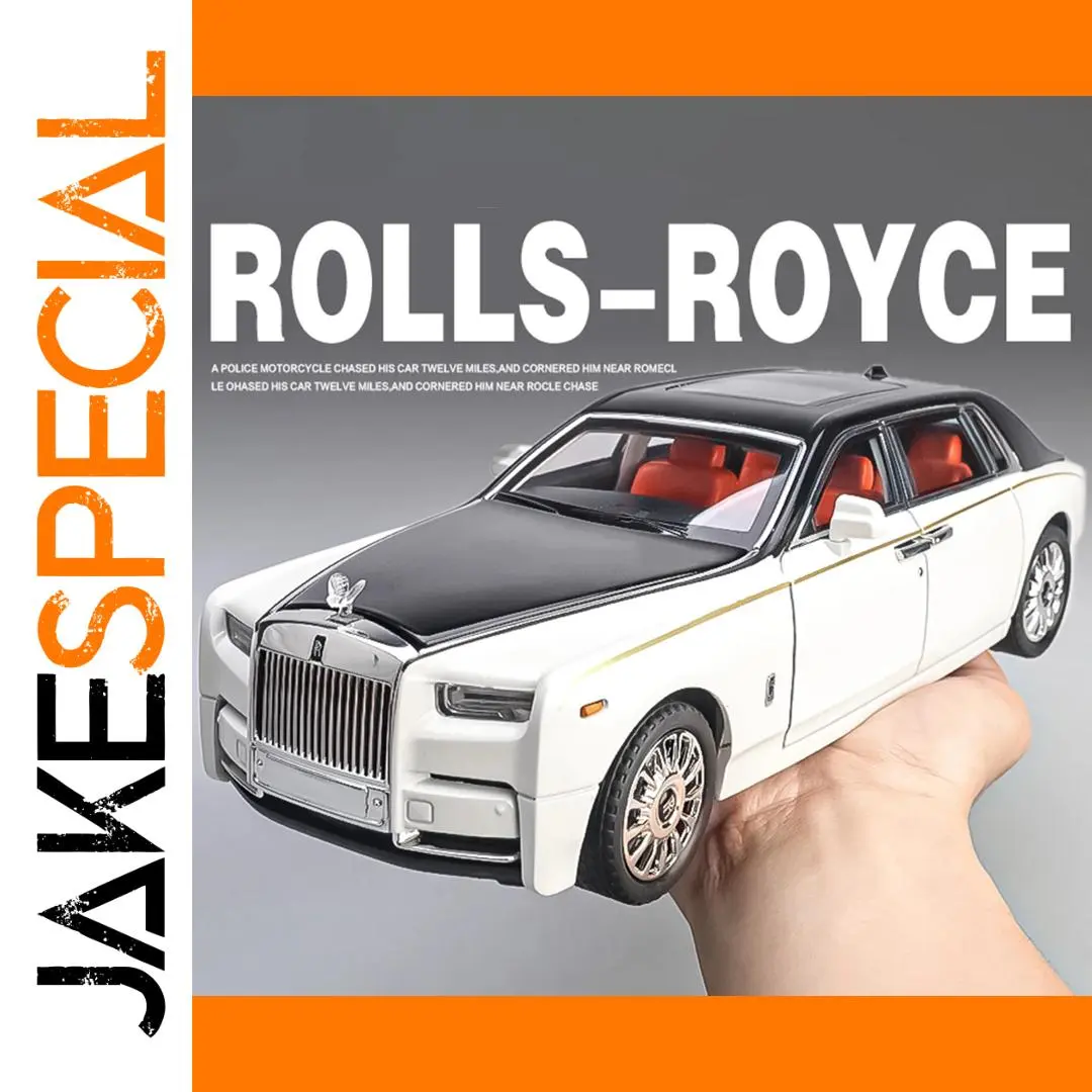 Experience the luxury and craftsmanship of the 1:18 scale diecast model cars, featuring a realistic metal body, plastic chassis, and rubber tires with shock absorption. The Rolls-Royce Phantom measures approximately 29 x 10.2 x 7.5 cm, available in elegant white with a contrasting black roof, showcasing a smooth, flowing design, a prominent grille, Spirit of Ecstasy ornament, and chrome multi-spoke wheels. The model offers opening doors, engine hood, and trunk for detailed viewing, along with sound and light functions, pull-back movement, and durable construction. Batteries are included, making it perfect for collectors and enthusiasts over age 14 seeking a high-quality, display-worthy miniature.