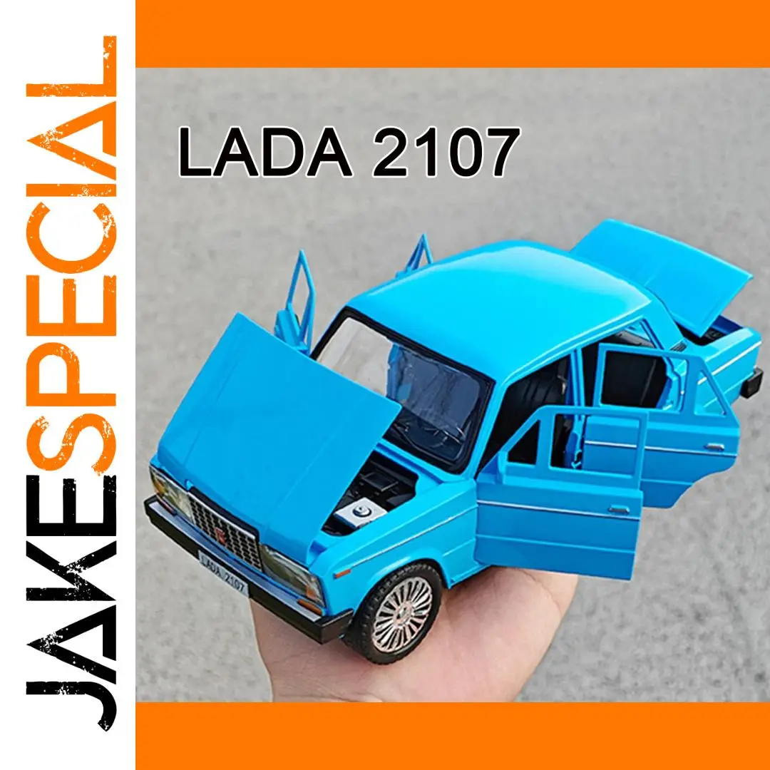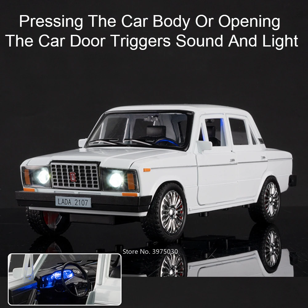 Experience the realism of the 1:18 scale Russian LADA 2107 model car, featuring a vibrant blue finish with matching doors, trunk, and hood for a sleek appearance. Crafted from zinc metal with a plastic chassis and rubber tires with detailed tread patterns mounted on contrasting white and black alloy wheels, this durable miniature measures approximately 22.5 cm long, 9.8 cm wide, and 8.5 cm high. It boasts six functional doors that open, built-in sound and light effects activated by included batteries, and a convenient pull-back mechanism for movement. Available in blue, black, and white, this high-simulation model is perfect for collectors seeking a detailed, energetic replica.