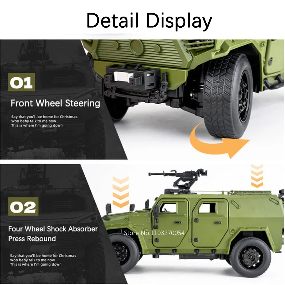 Experience the thrill of commanding a highly detailed military vehicle with this realistic 1:18 scale diecast model. Crafted with a durable metal alloy body, precise plastic chassis, and rugged rubber tires, this miniature replica boasts impressive authenticity. Its rugged Mengshi Green, UAZ White, and UAZ Green finishes highlight a tactical, military-inspired aesthetic. The model features functional opening doors, a rotating turret, and impressive sound and light effects that simulate real combat scenarios. Whether you display it as part of your collection or gift it to a passionate enthusiast, this sturdy toy offers unmatched realism and durability. Elevate your admiration for military engineering with this meticulously crafted miniature; it’s a perfect combination of quality, detail, and interactive features.