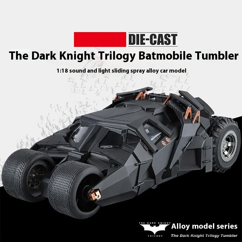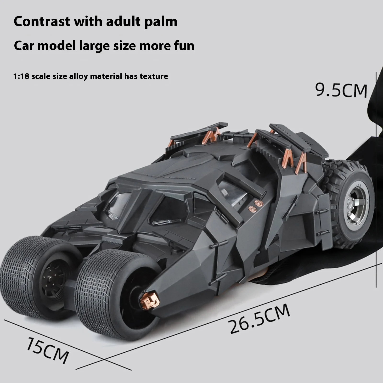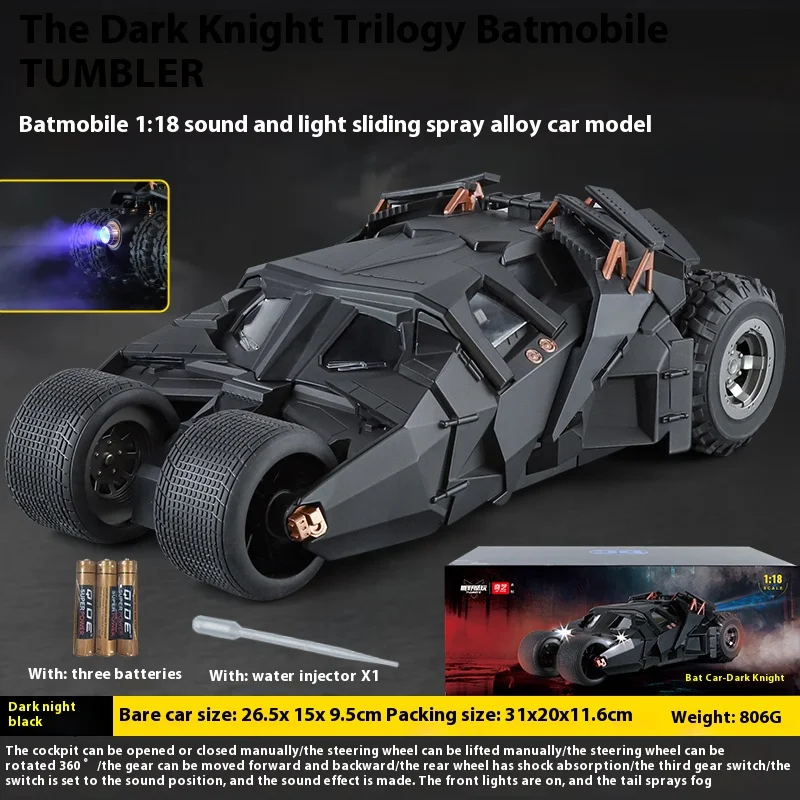 Experience the thrill of owning this striking 1:18 scale Batmobile diecast model, expertly crafted from durable metal. Its sleek black exterior and aggressive, futuristic design bring the iconic vehicle to life, perfect for display in any collector’s space. The model features angular, geometric lines, a low-profile stance, and a pointed layered nose that exudes speed and power. Small LED-like lights embedded in the midsection and rear panels enhance its modern, high-tech aesthetic. Equipped with sound and light spray functions, it delivers an immersive display experience. Its compact size makes it ideal as a desktop ornament, and the high-quality finish promises lasting detail. Whether you’re a Batman aficionado or a diecast model enthusiast, this model makes a commanding visual statement.