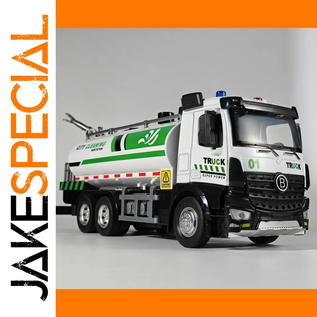 Experience the realism of a 1:18 scale city sprinkler truck with this detailed diecast model, crafted from sturdy metal. Featuring sound and light functions, it includes a pull-back mechanism for smooth movement, making it an engaging collectible. Designed for ages 14 and above, the model showcases a white water tank with green and black graphic accents, reflecting the functional, heavy-duty aesthetic of urban sanitation vehicles. Its meticulous detailing, including black grille, bumper, side mirrors, emergency lights, safety decals, and textured black tires with silver rims, creates an authentic display piece perfect for enthusiasts and collectors who appreciate large-scale, industrial-style models.