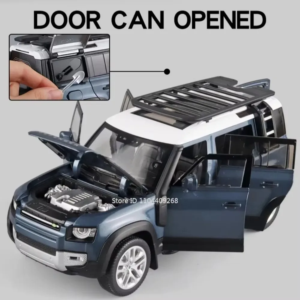 Experience the thrill of off-road adventures with this stunning 1:18 scale Defender 110 SV2022 diecast model. Crafted with a sleek, deep blue glossy finish, complemented by contrasting silver accents, this vehicle exudes both style and realism. The sturdy metal body paired with a durable plastic chassis and rugged rubber tires creates an authentic, high-quality feel. Its detailed front grille, crisp headlights, and accessible doors highlight the craftsmanship. The black roof rack adds a utilitarian touch, making it visually striking. Ideal for collectors and enthusiasts, this model offers functional features such as sound and light effects, front wheel steering, shock absorption, and opening doors—bringing play or display to a new level of authenticity. Elevate your collection today.