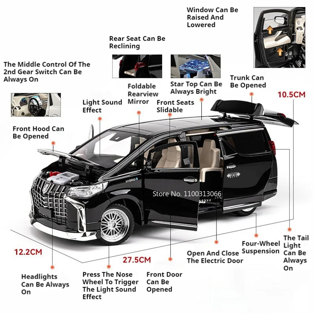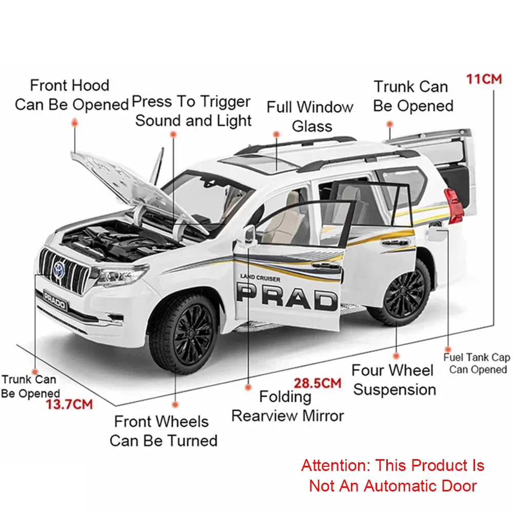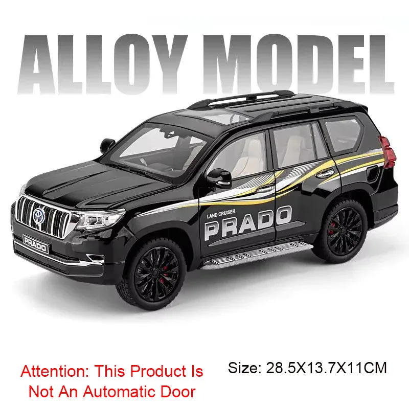Experience the detailed realism of this 1:18 scale diecast MPV model, available in black and white for both Alphard and Prado variants. Crafted with a durable alloy metal body, plastic chassis, and rubber tires with intricate tread patterns, it measures approximately 27.5 x 12.2 x 10.5 cm (Alphard) and 28.5 x 13.7 x 11 cm (Prado). The model features six openable doors, highly realistic headlight and taillight details, and a sleek, polished exterior with well-defined lines and a sunroof. Complete with light and sound functions, pull-back movement, and included button batteries, this collectible toy perfectly blends craftsmanship with playability for enthusiasts and collectors aged 14 and above.