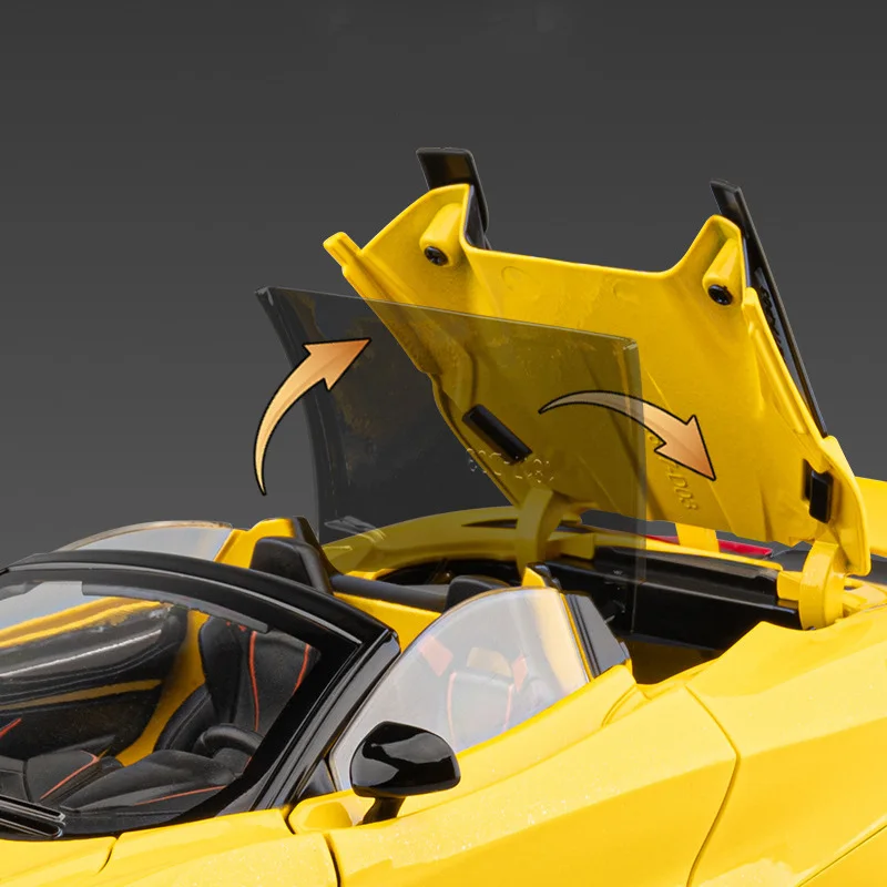 Experience the thrill of speed with this stunning 1:18 scale alloy track racing car model. Crafted from durable diecast metal and plastic, it boasts a sleek, aerodynamic design that captures the essence of modern racing. The striking yellow body is accented with glossy black details, creating an eye-catching contrast that emphasizes its sporty character. Its low-profile, flowing lines and realistic features—such as sharp headlights, side mirrors, grille, and integrated rear spoiler—bring authenticity to your collection. The gull-wing doors open upward, adding a futuristic touch. Perfect for display or imaginative play, this model also features simulation sound and lighting effects that enhance its lifelike appeal.
