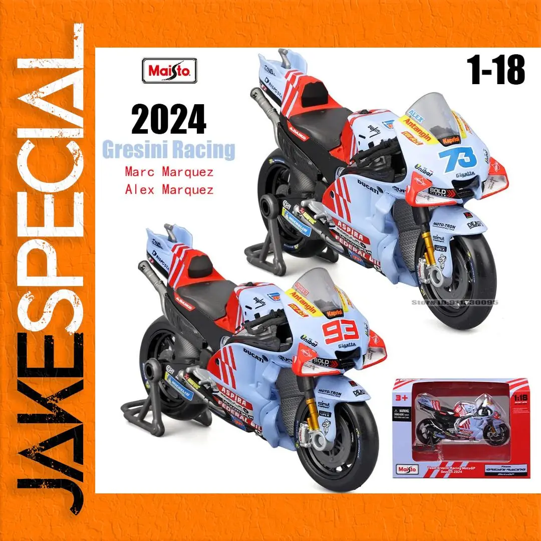 This detailed 1:18 scale diecast motorcycle model from Maisto captures the 2024 Gresini Racing MotoGP bikes ridden by Marc Marquez (#93) and Alex Marquez (#73). Made from high-quality metal, it features vibrant liveries in colors such as white, blue, red, and black, with bold rider numbers in contrasting red and yellow. The model showcases aerodynamic fairings with detailed sponsor decals, gold front forks, realistic wheels with brake discs and calipers, and a sculpted black seat with red accents. Packaged securely in shock-absorbing foam, it offers a stunning and accurate representation of professional racing bikes, ideal for collectors aged 4 and above.
