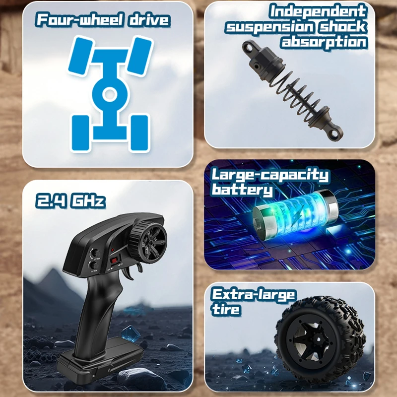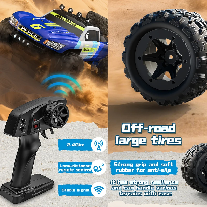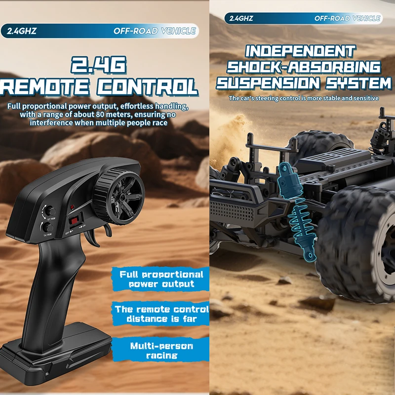 Experience high-speed off-road performance with this 1:18 scale RC truck, capable of reaching speeds up to 30 km/h. Featuring a durable, explosion-proof PVC shell, four-wheel independent shock absorption, and a dual differential 4WD system, it ensures excellent traction and durability on rugged terrains. Powered by a 380 electric motor and a 7.4V 1500mAh lithium battery (included), the vehicle runs for approximately 22 minutes with a control range of at least 80 meters. Equipped with a 2.4G full proportional remote system, it offers precise steering, throttle, and speed adjustments, perfect for adult hobbyists seeking speed, stability, and realism in off-road racing.