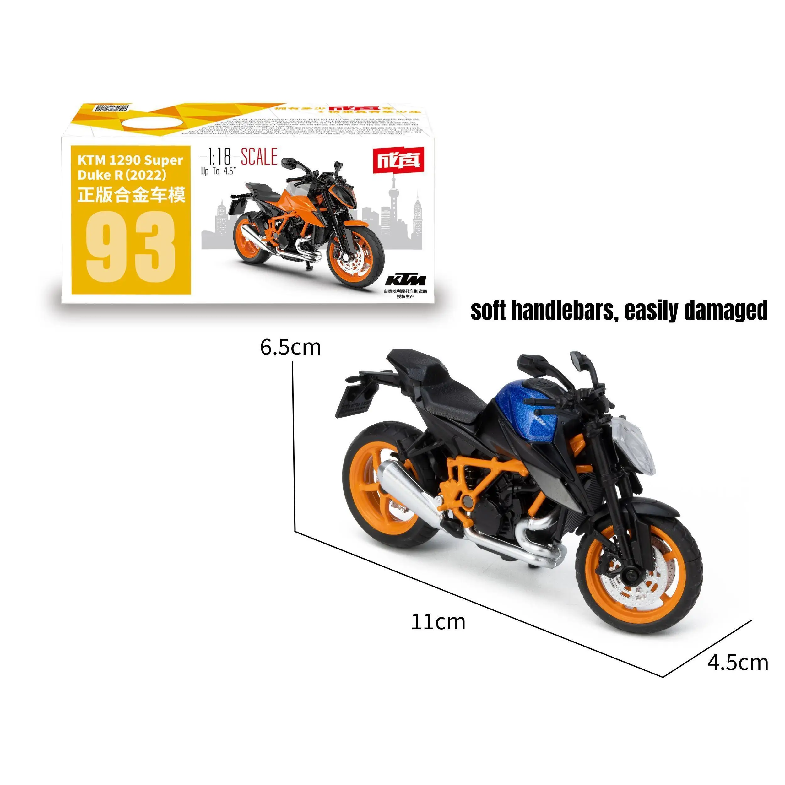 Immerse yourself in the dynamic design of this 1:18 scale KTM 1290 Super Duke R miniature. Crafted from durable diecast metal, it features a sleek black finish with vibrant orange accents on the frame and wheels, capturing the bold spirit of the real motorcycle. The model's realistic details include intricate control elements, clear plastic headlight covers, and textured rubber tires with accurate tread patterns. Its aerodynamic front fender, metallic light gray fuel tank, black seat, and silver exhaust pipe bring authenticity to your collection. Whether displayed on a shelf or used as a gift, this model elevates any space with its high-energy aesthetic and meticulous craftsmanship. Perfect for enthusiasts and collectors who appreciate detailed craftsmanship.