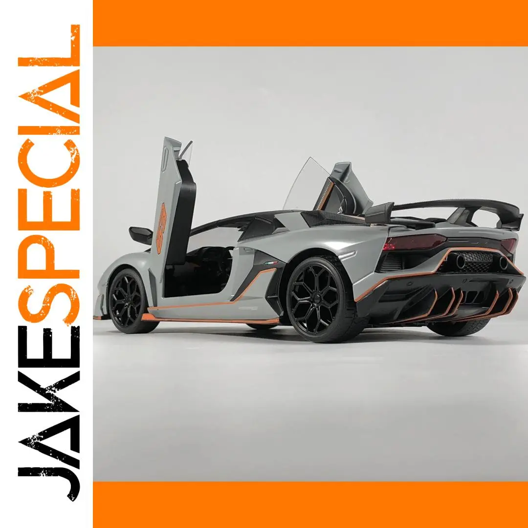 Immerse yourself in the sleek sophistication of this highly detailed 1:18 scale diecast model of the Lamborghini Aventador SVJ. Crafted from high-quality alloy, this collectible showcases a striking design with an aerodynamic silhouette, sharp contours, and bold color accents. The body is primarily a sophisticated light grey, accented by contrasting black details and vivid orange lines tracing along the sides, front, and rear to emphasize its sporty and aggressive aesthetic. Features include a prominent rear spoiler, realistic tail lights, intricately crafted twin exhaust pipes embedded in a black diffuser, and large, multi-spoke black wheels with textured tires. Every detail is meticulously rendered, making this model a true testament to craftsmanship and ideal for display or collector’s admiration.