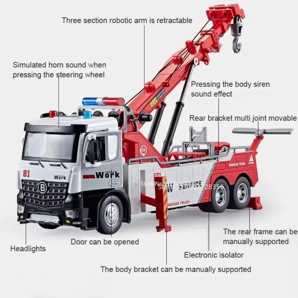 The 1:18 Double Hook Obstacle Clearing Vehicle Model features a durable alloy diecast construction with a metal body, plastic chassis, and rubber tires. This model incorporates sound and light functions, operable doors, and a fully movable bracket with an extendable three-section robotic arm. Available in vibrant colors including Red, Blue, Green, and Orange, the JD8558 model measures approximately 30*8*11 cm, while the JD8668 model measures about 36*9*12 cm. Designed for resilience, this high-simulation model is perfect for both play and display, showcasing intricate detail and craftsmanship for collectors and enthusiasts.