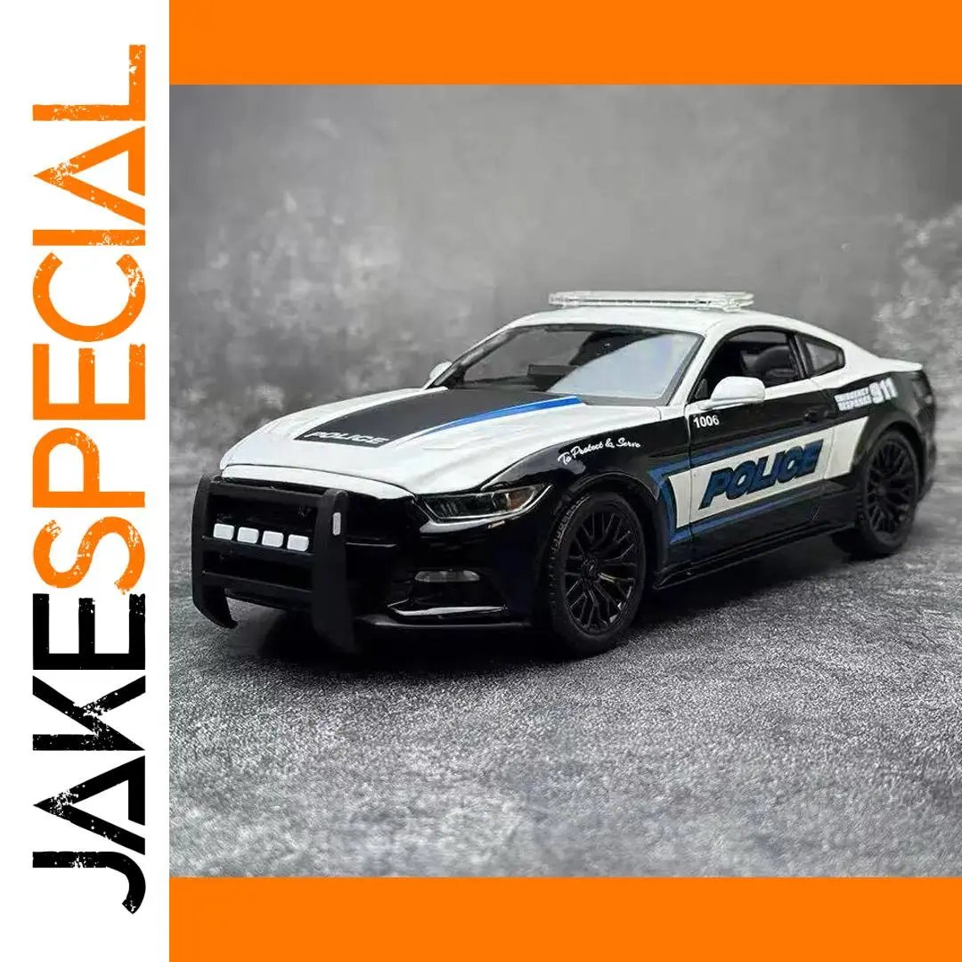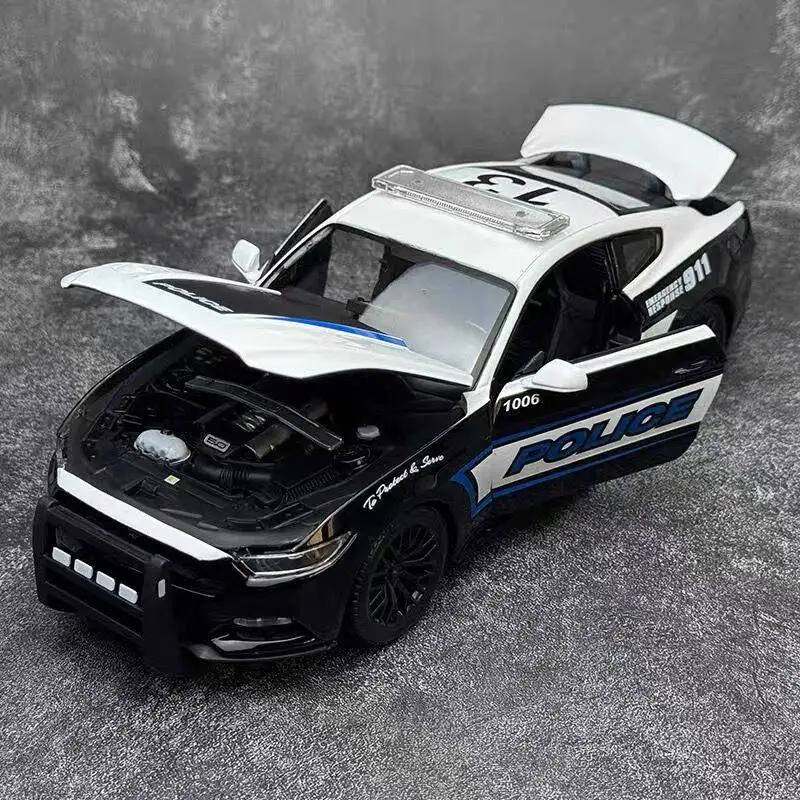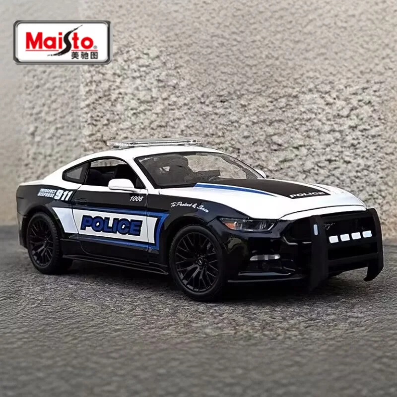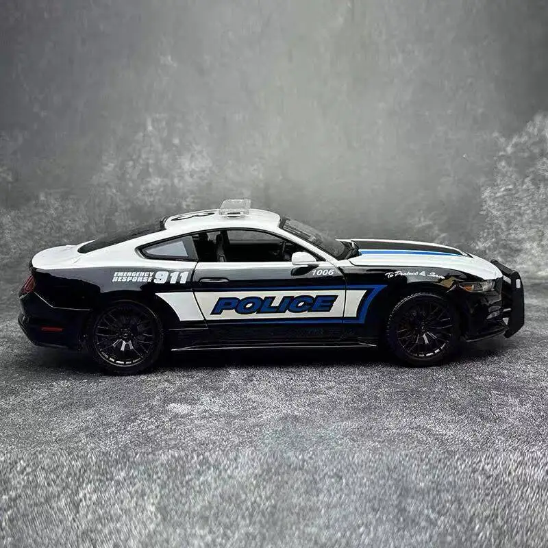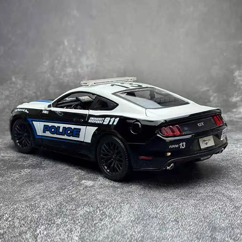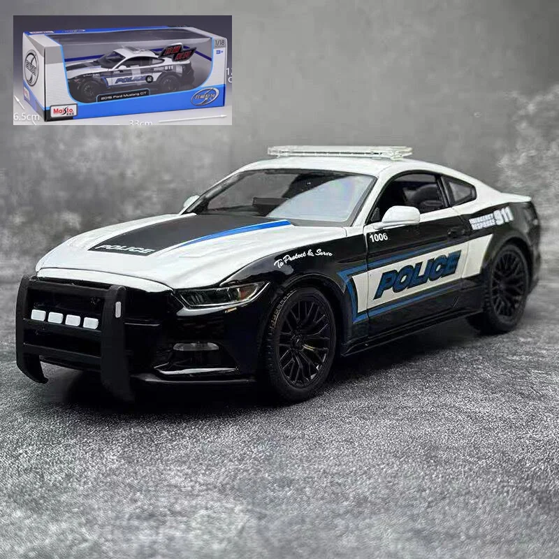 This highly detailed 1:18 scale diecast model of a 2015 Ford Mustang GT police sports car offers a striking black body with contrasting white hood and roof, accented by bold black and blue police graphics. Crafted from alloy and plastic, it features realistic contours, a black grille, dark blue “POLICE” decals on the side doors with smaller white markings, and black multi-spoke wheels. Transparent windows reveal a simplified interior, capturing the authoritative yet sporty aesthetic of a real police vehicle. Suitable for collectors and enthusiasts aged 14 and above, it arrives packaged in either a foam or retail box, making it a perfect display piece or an impressive gift.