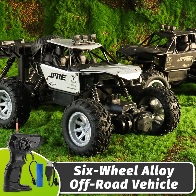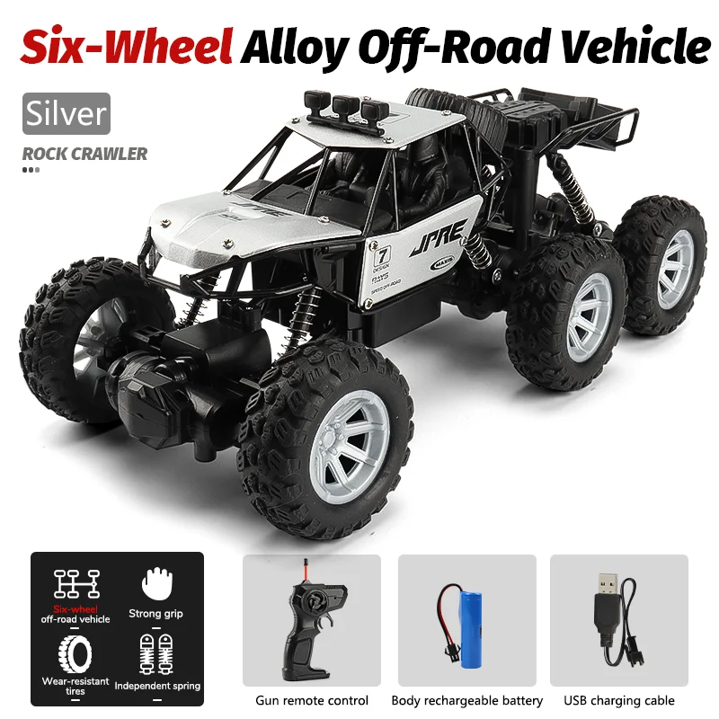 Experience off-road adventures with this 1:18 scale RC mountain climber, featuring a rugged six-wheel alloy chassis measuring 25.5 x 13.5 x 11.5 cm. Designed for durability, it combines metal, plastic, and rubber construction, with large, deep-tread tires mounted on metallic silver rims for superior grip on rough terrains. Equipped with four control channels, a steering servo, and a 3.7V power supply powering up to 22 meters remote control distance, this ready-to-use electric model is perfect for enthusiasts aged 6 and above. Included are a remote controller and USB charging cable, offering a realistic, action-packed experience with a 30-day warranty for peace of mind.