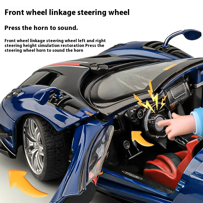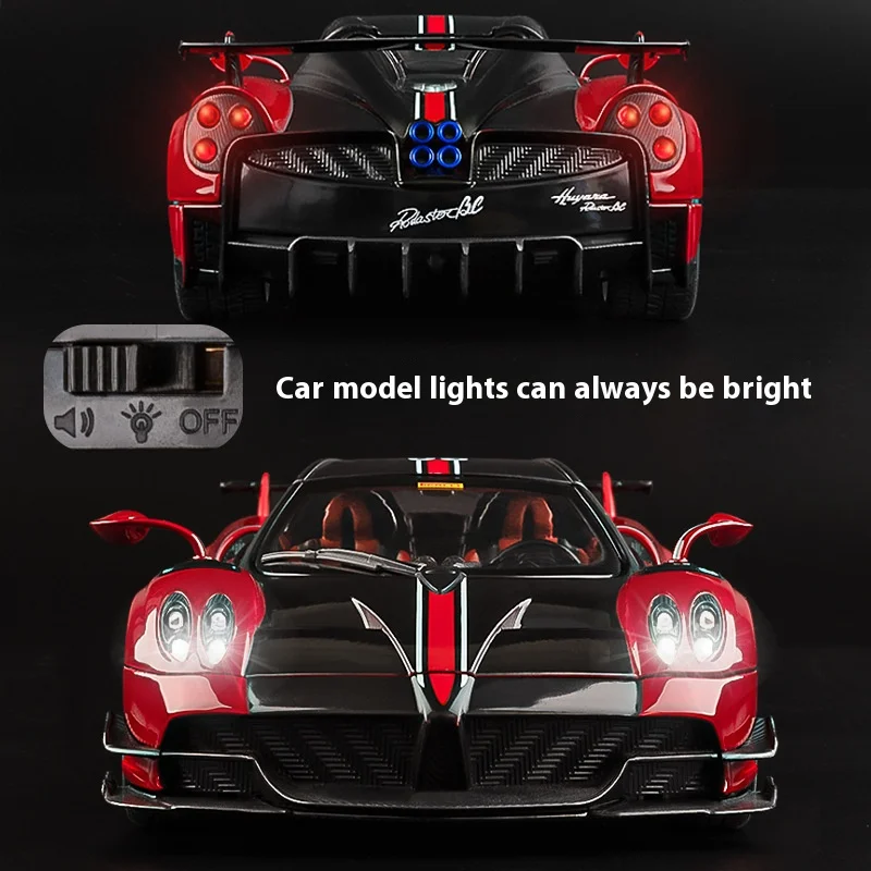 Experience the thrill of speed with this 1:18 scale die-cast alloy sports car model, presented in a striking red finish. Its sleek, aerodynamic design features sharp lines and contours, complemented by bold black accents and racing stripes. The detailed interior showcases simulated red and black seating, a fully equipped dashboard, and a steering wheel, enhancing its realistic appeal. This model includes openable parts, revealing its intricately crafted engine compartment. With cool lighting and sound effects, this desktop ornament captures the essence of high-performance vehicles. Crafted from durable metal, it’s the perfect addition to any collection or display.