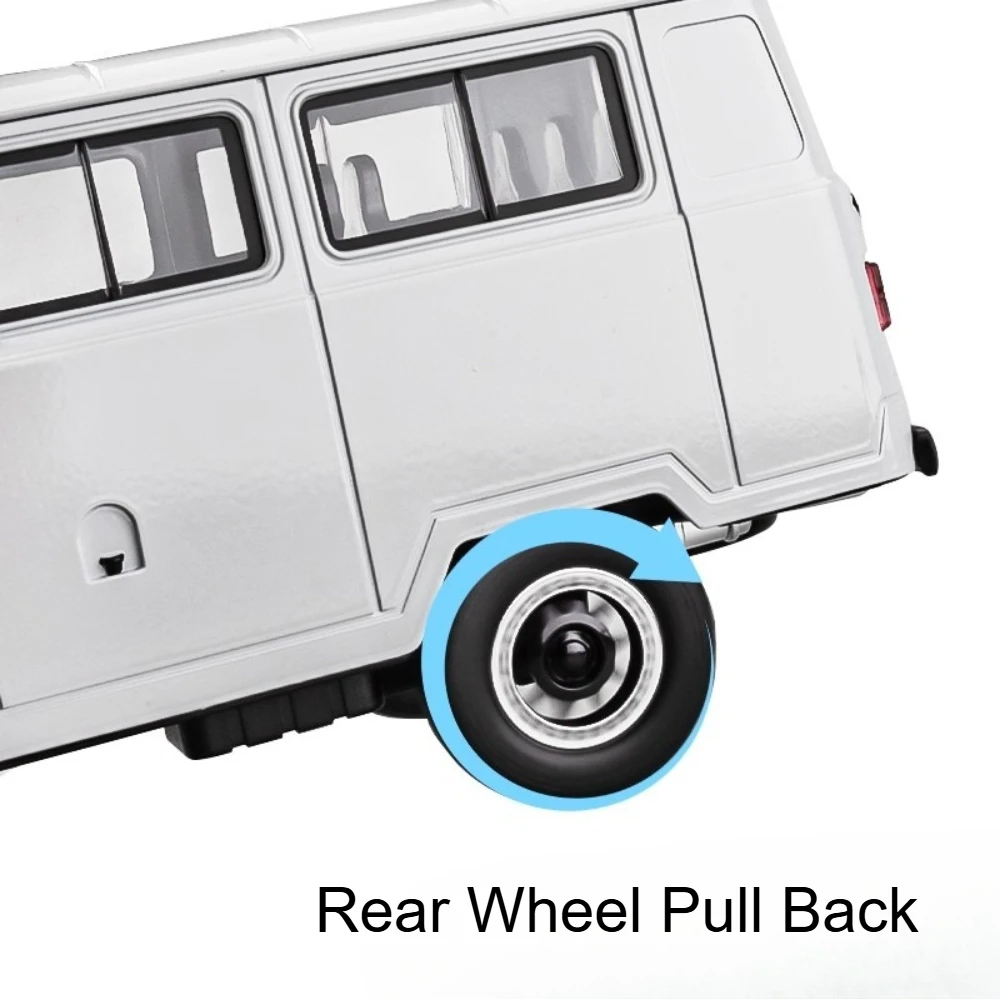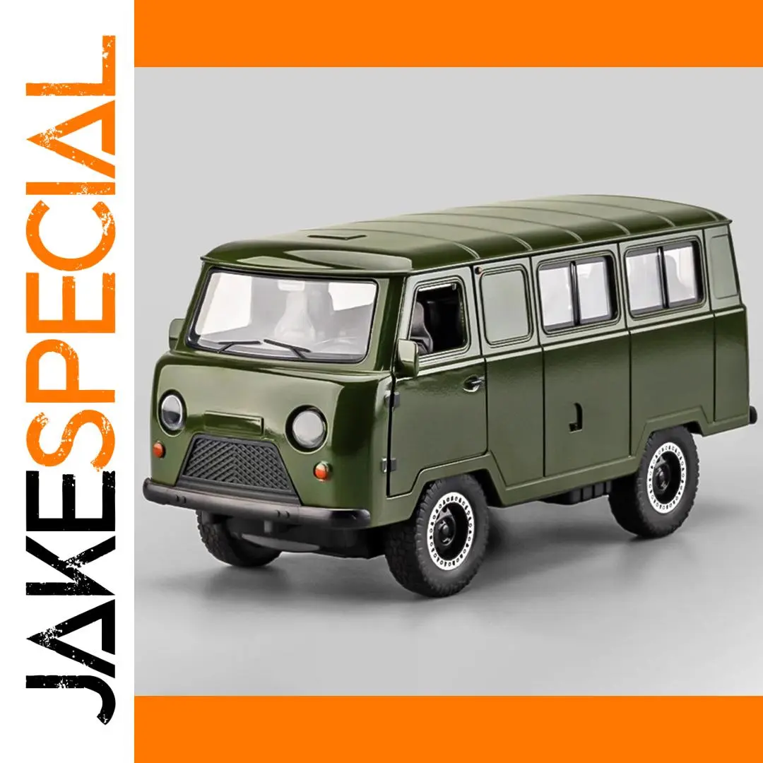 Experience the rugged charm of this highly realistic 1:18 scale Russian UAZ Traveler diecast model. Perfect for collectors and enthusiasts alike, this miniature captures the vehicle’s distinctive boxy profile, rounded front contours, and flat side panels. The matte olive green finish enhances its vintage, military-inspired aesthetic, while the detailed front grille, divided rectangular windows, and prominent headlights add authenticity. It features working doors with visible handles, side mirrors, and textured rubber tires mounted on white-ringed hubcaps, all crafted for lifelike realism. With sound and light functions plus a pull-back mechanism, this model provides interactive fun and display quality. Its precise build makes it an eye-catching addition to any collection or display setup, evoking a sense of adventure and craftsmanship.