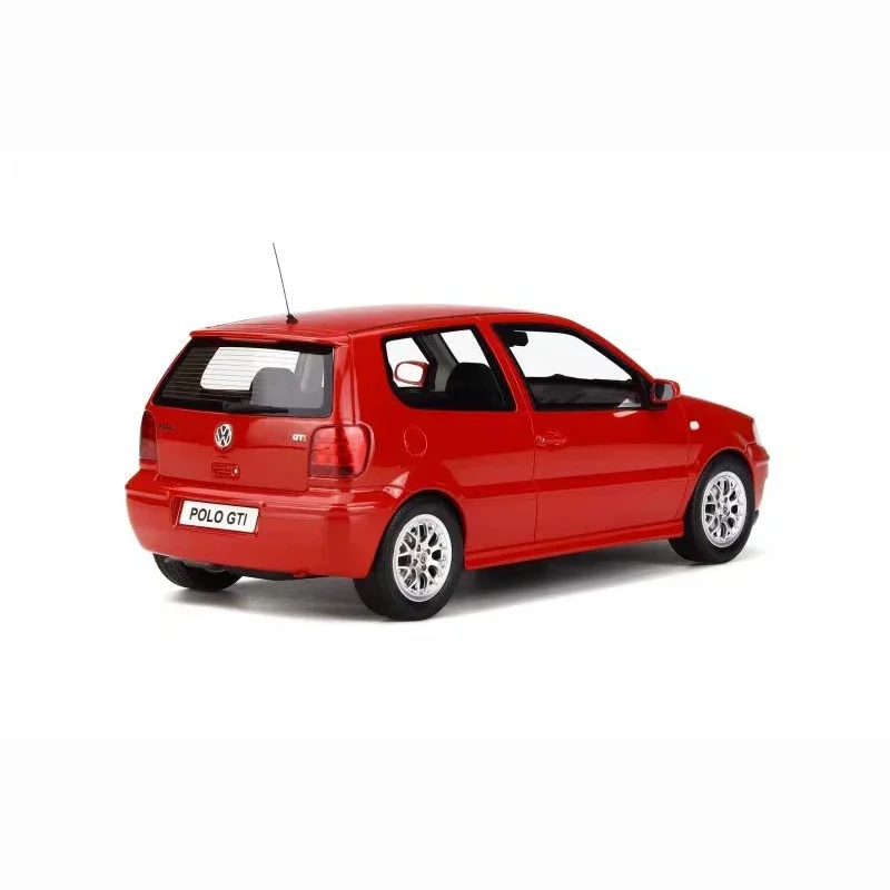 - Technical specifications include: resin body, plastic windows, rubber tires, black accents on the bumper, silver alloy wheels, detailed tail lights, and a small roof antenna, capturing the true essence of the Volkswagen Polo GTI.
