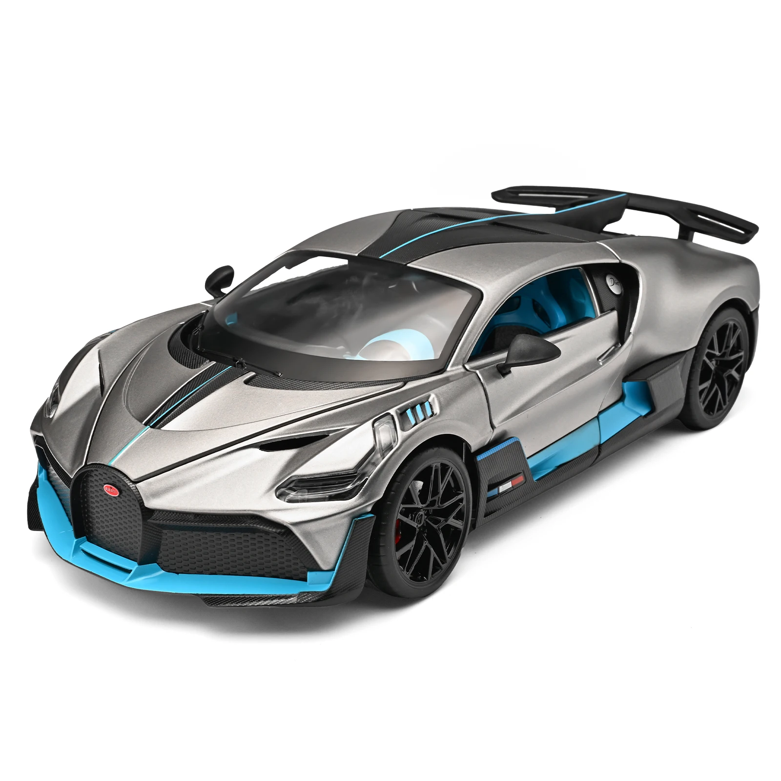 - Includes detailed features such as textured black vents, side skirts, a prominent rear spoiler, and multi-spoke racing wheels.