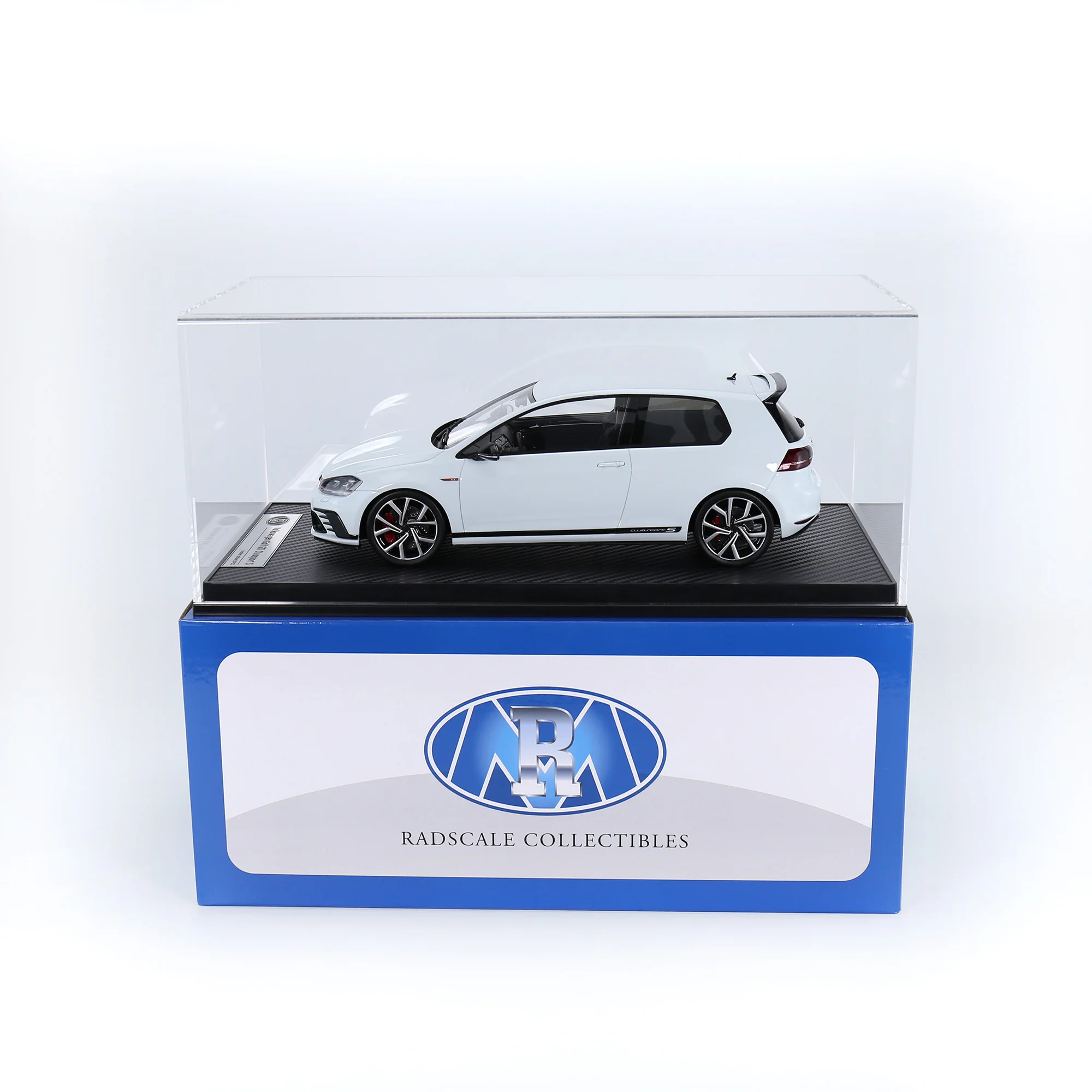 Discover the exquisite craftsmanship of this 1:18 scale resin replica of the Volkswagen Golf GTI Clubsport S by RadScale collectibles. Its sleek, aerodynamic white body features bold black accents, including side mirrors, window tints, and a subtle black stripe along the lower side, emphasizing its sporty character. The front grille boasts a distinctive red accent and precise headlamp details with clear lenses, while the rear showcases a roof spoiler, taillights, and exhaust outlets that mirror the real vehicle’s dynamic design. The model’s multi-spoke alloy rims with a machined finish and striking red brake calipers highlight its high-performance aesthetic. Ideal for collectors, this customized replica is crafted with meticulous precision, capturing the essence and spirit of the original high-performance hatchback, making it a true centerpiece for any display.