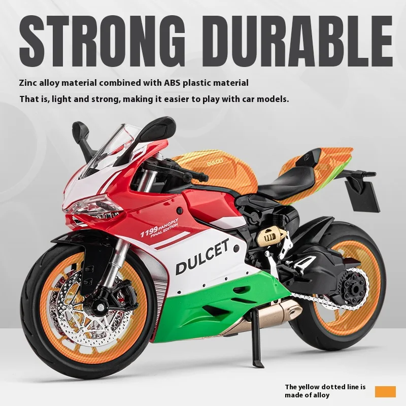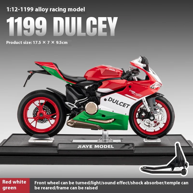 This exquisite model of the racing motorcycle “1199 DULCEY” is designed to impress. Its striking red and vibrant green color scheme, featuring bold white accents, makes it a breathtaking decorative piece for your car center console or as an exceptional gift. Weighing in at 0.55 kg and crafted from high-quality zinc alloy, this model embodies realism with intricate details such as the aerodynamic fairing, detailed headlights, and textured wheels. The iconic branding on the side panels further enhances its aesthetic appeal, while the visible exhaust system adds to its authenticity, transforming any space into a showcase of fine craftsmanship.