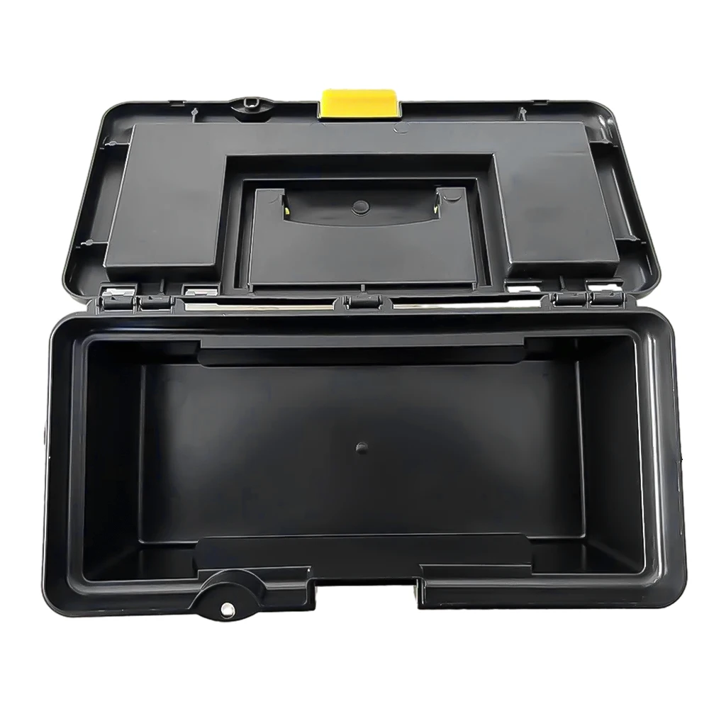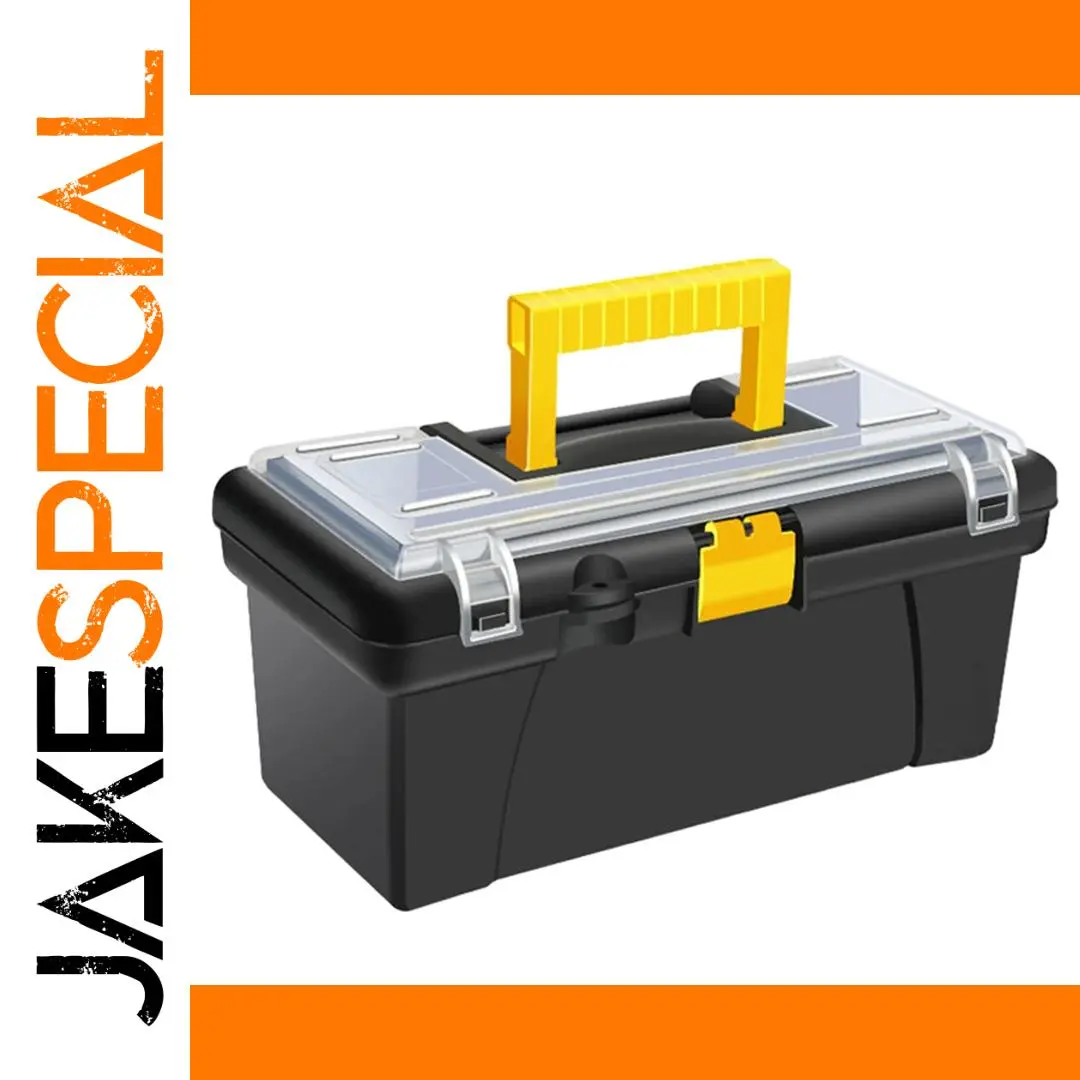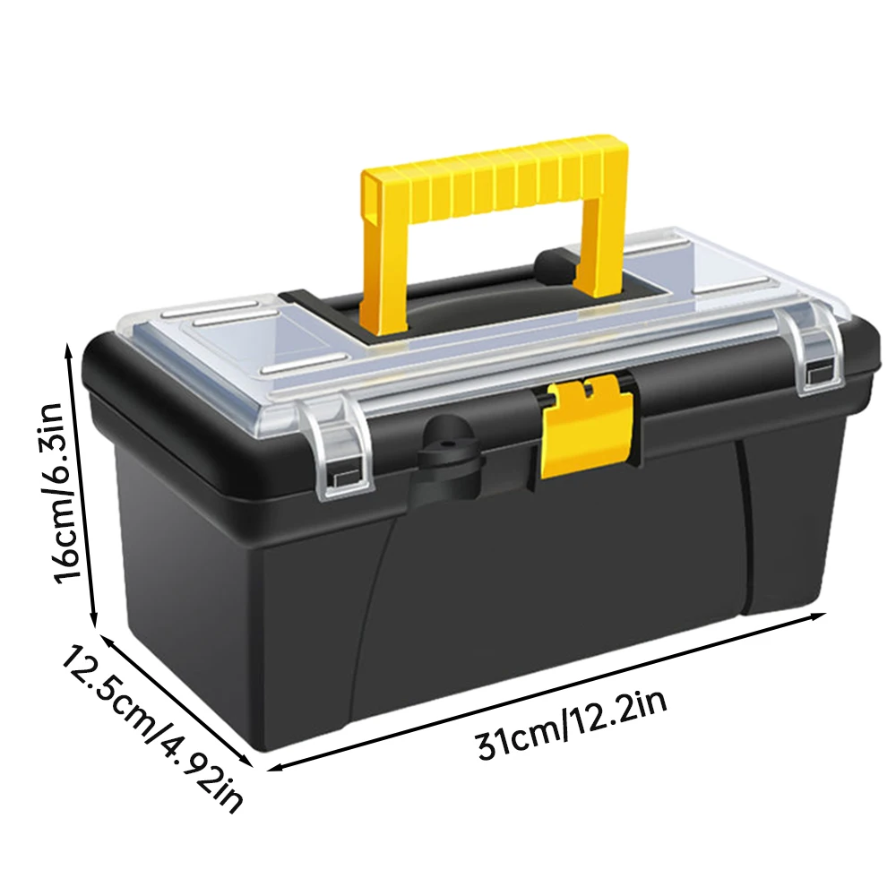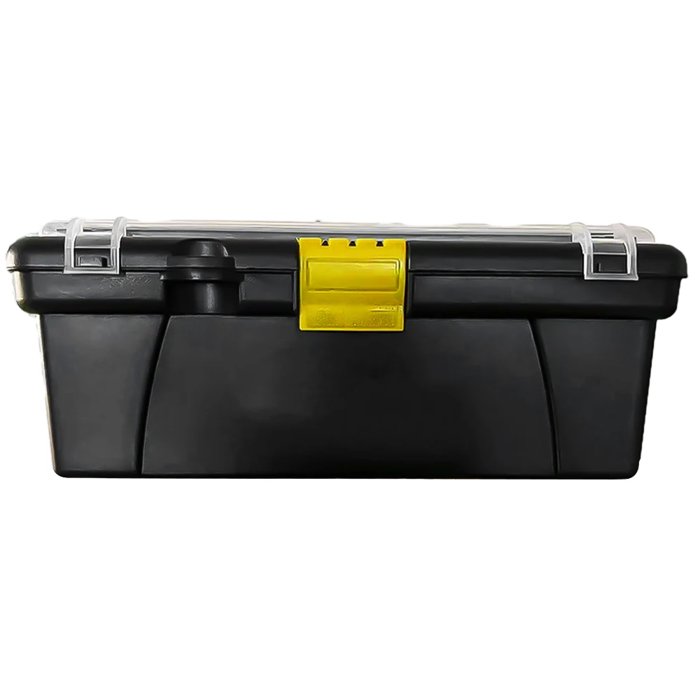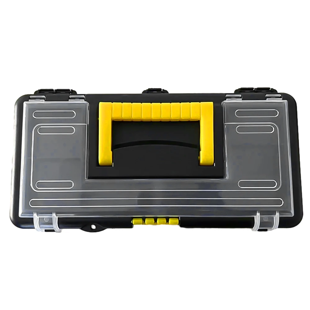 Imagine having your tools perfectly organized and easily accessible whenever you need them. This this 12-inch toolbox combines practicality with durability, providing a reliable storage solution for both professional and DIY projects. Its sleek black body is accented with vibrant yellow hardware, including a sturdy handle and secure latch, ensuring easy transport and safety during use. The transparent lid reveals the internal compartments, allowing you to quickly locate screws, nuts, or small parts without opening the entire box. Built from environmentally friendly polypropylene, it resists extreme cold, falls, and cracks, making it ideal for outdoor or indoor use. Whether you're a carpenter, electrician, or hobbyist, this box will streamline your workspace and enhance your efficiency.