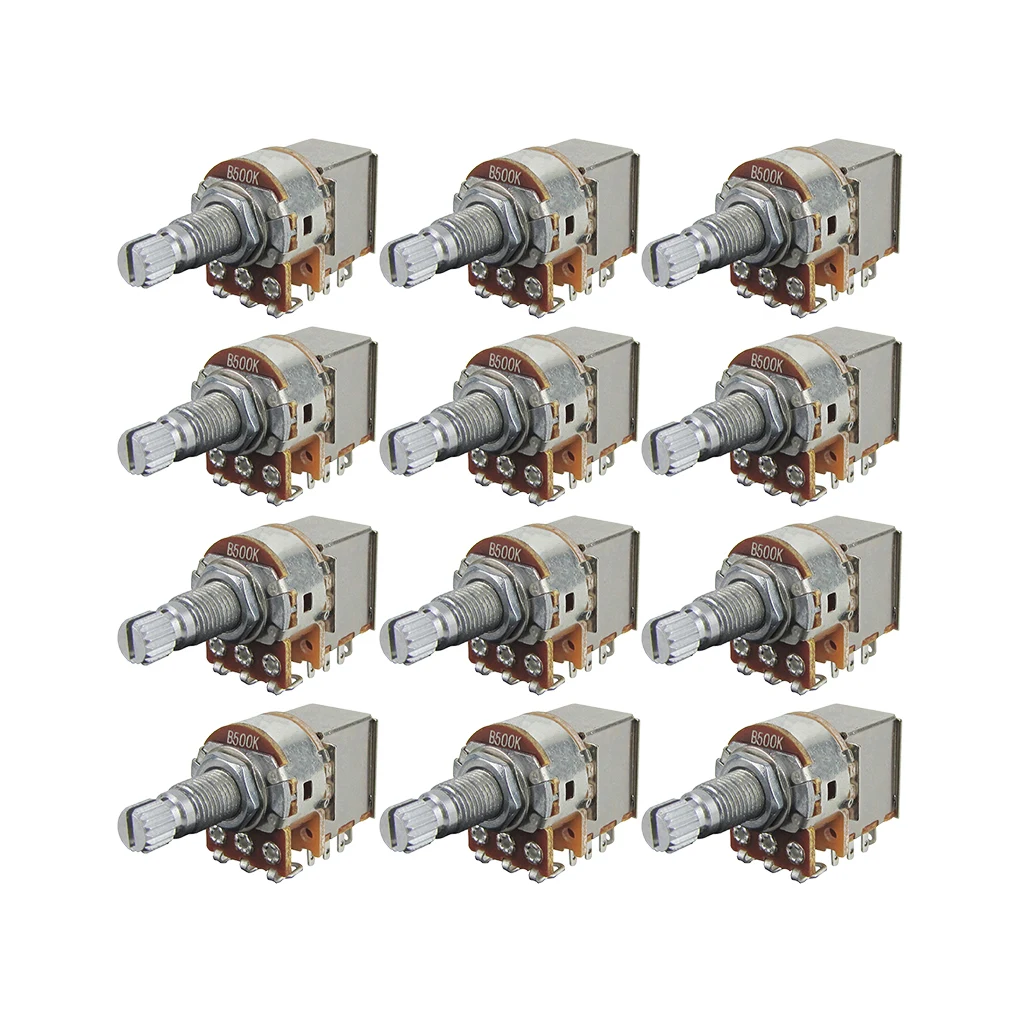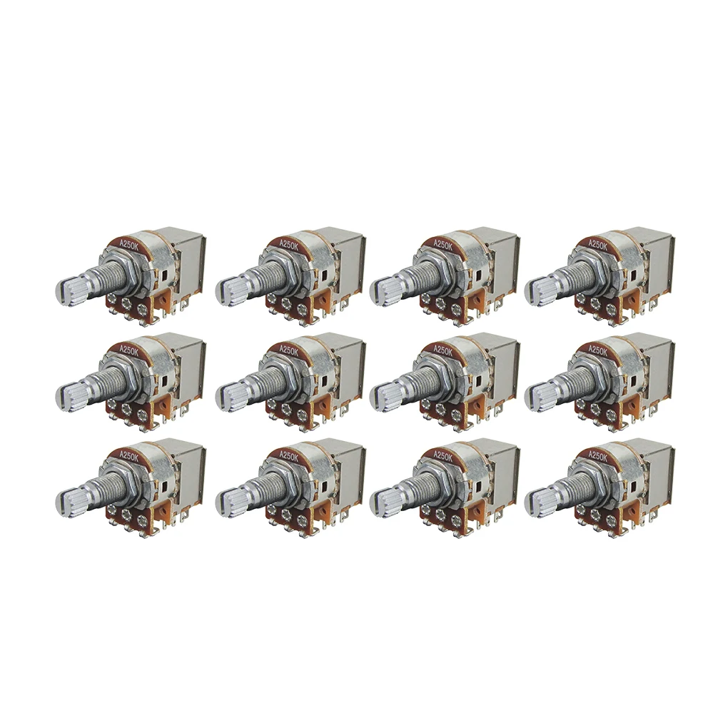 Upgrade your electric guitar or bass with this set of 12 durable metal push-pull potentiometers featuring a sleek silver finish. Choose between 250K ohm or 500K ohm resistance options with Audio (Log) or Linear (B) tapered options to tailor your sound. The long, split shaft measures approximately 18mm in length and 6mm in diameter, with a 7mm thread diameter, allowing easy installation on pickguards or control plates. Each potentiometer has an overall length of roughly 43.5mm and includes washers and nuts for secure mounting. Perfect for customizing tone and volume controls, these high-quality parts offer both style and functionality for professional guitar builds.