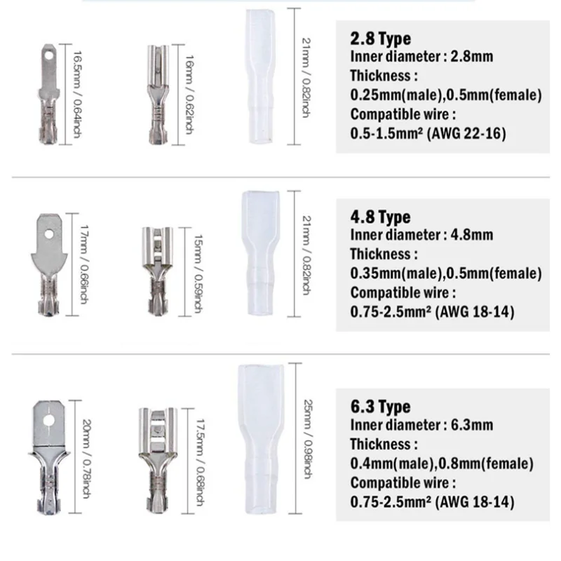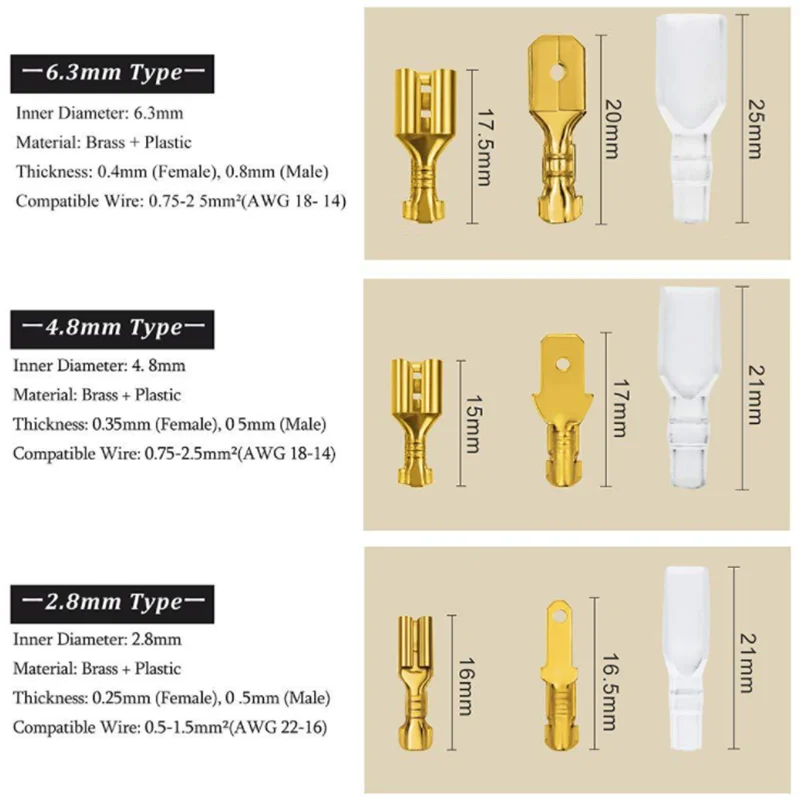 - Terms are available in three sizes—2.8mm, 4.8mm, and 6.3mm—catering to various connector needs and ensuring precise fitment.