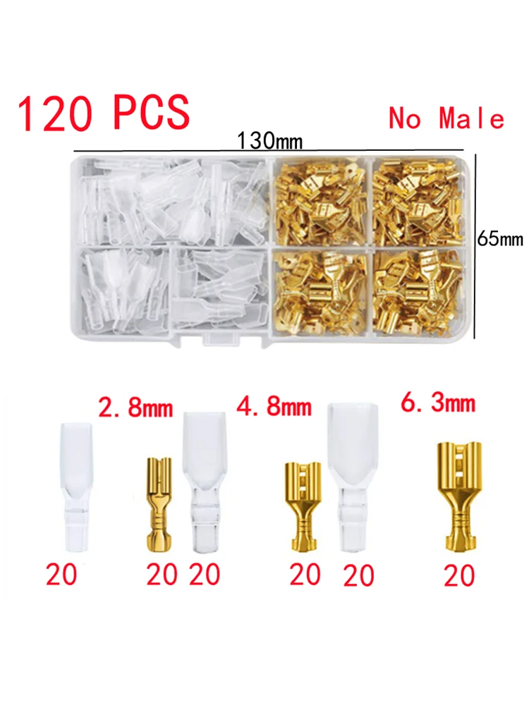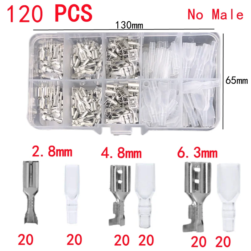 Imagine your electrical projects seamless and professional with this set of 120 high-quality female crimp terminals. Designed for secure, reliable connections, these terminals come in a sleek, organized transparent container that makes selecting the right size effortless. The shiny gold terminals add a touch of sophistication with their reflective, corrosion-resistant finish, while the matte silver ones offer a subtle, durable look. Whether you're working on automotive wiring, household appliances, or custom electronics, these terminals provide a clean, efficient fit. With three sizes—2.8mm, 4.8mm, and 6.3mm—you're equipped for numerous applications. Easy to handle and built for longevity, this set ensures your wiring stays secure and performs flawlessly over time.