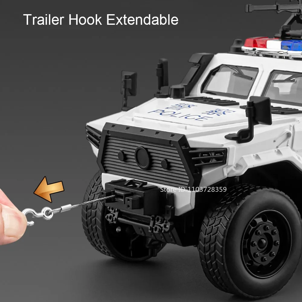 - Equipped with sound and light functions, pressing specific areas triggers realistic effects like horn sounds, siren lights in red, white, and blue, adding to its military-police style.
