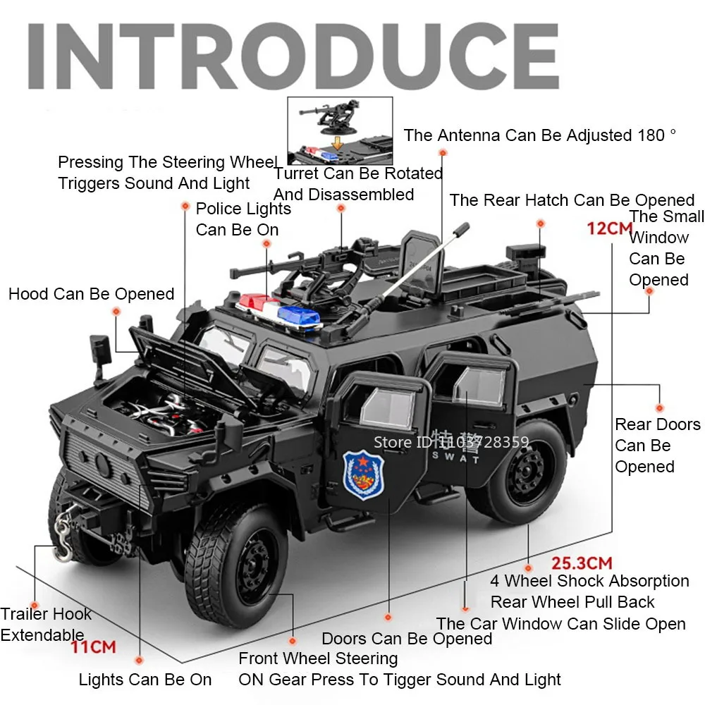 Experience the impressive design and durability of this detailed 1:20 scale alloy toy model of DongFengMengShi armored vehicle. Crafted with a sturdy metal body, plastic chassis, and rubber tires, this model captures the rugged appeal of military-police vehicles with authentic textures and markings. Its size of approximately 25.3 x 11 x 12 cm makes it a perfect display or play item for enthusiasts and collectors. With realistic opening doors, trunk, and engine hood, you can explore intricate interior details. The pull-back mechanism offers smooth forward movement, while the shock-absorbing tires allow it to tackle various terrains. Add this highly detailed, multifunctional model to your collection or gift it to a passionate enthusiast for an exceptional experience.