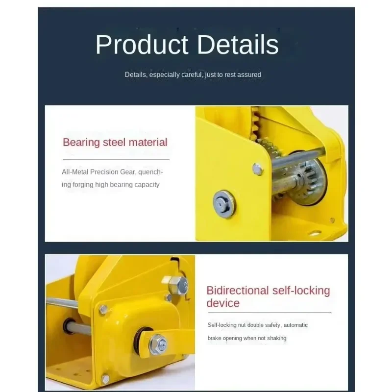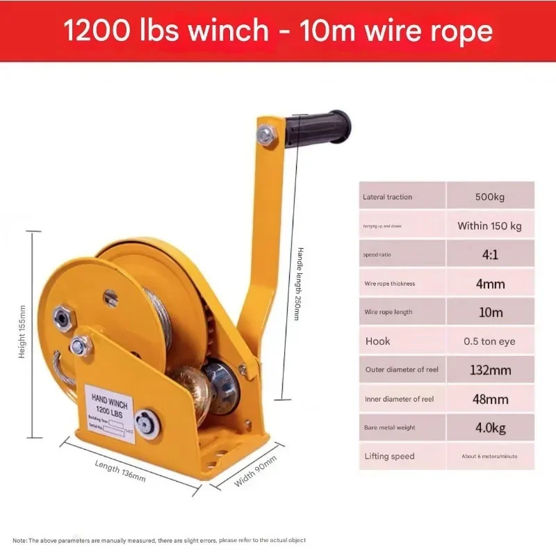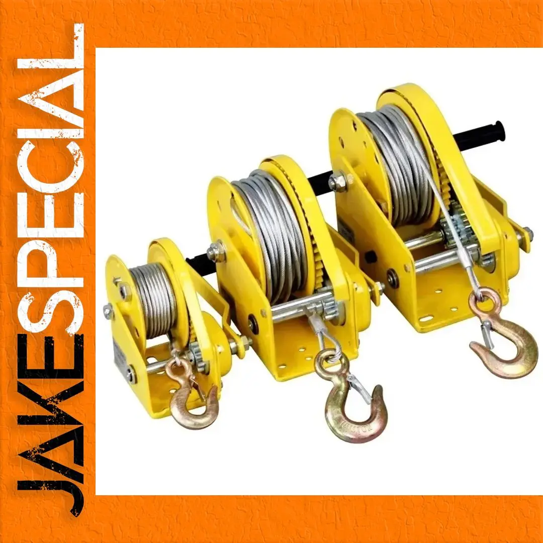 Experience efficient and reliable lifting with this high-capacity manual hand winch, perfect for small-scale projects, traction, and lifting needs. Its vibrant yellow finish combined with sleek black handles ensures both visibility and ease of use. Designed for convenience, the sturdy circular drum, with an outer diameter of 132mm and an inner diameter of 48mm, securely holds the 4mm thick steel wire rope wound around it, extending up to 10 meters. The winch features a robust 0.5-ton hook ideal for various pulling tasks. Its compact, portable design makes it an excellent choice for those who need strength and maneuverability in demanding environments, whether for industrial or recreational use. Easy to operate, it promises durability and efficiency every time you need to lift or pull.