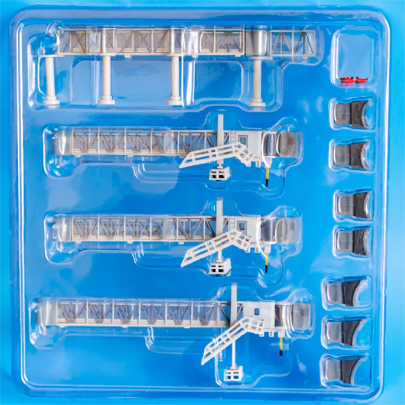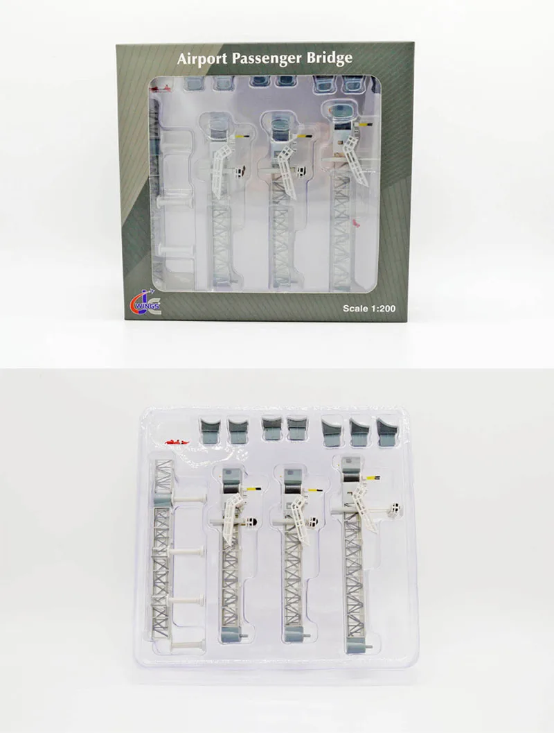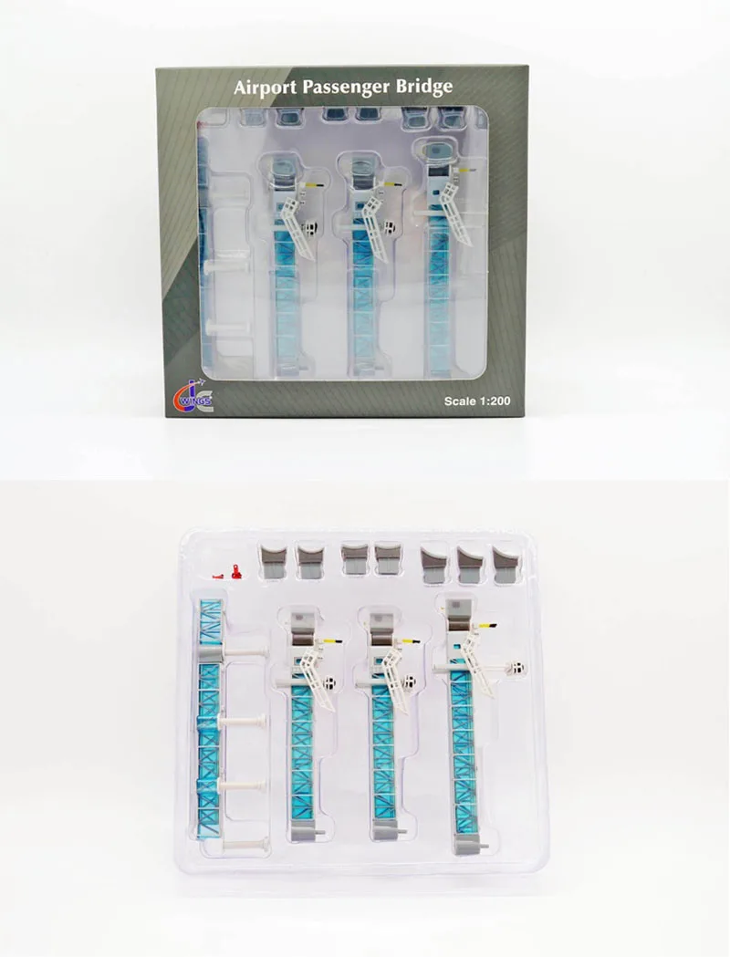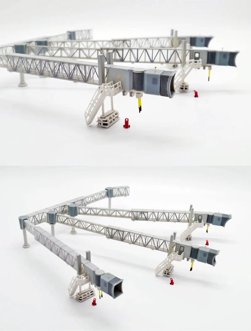 Bring your airport scene to life with this 1:200 scale diecast passenger boarding bridge, designed with three channels for A380 and wide or narrow-body aircraft models. Crafted from durable PC plastic, this realistic, non-electric model features a sleek, modern design with a light gray rectangular walkway accented by vibrant translucent blue glass-like panels. The structure includes intricate truss-like frameworks, smoothly curved semi-circular portals, and detailed white staircases with railings, supported by gray base platforms with slotted openings and subtle red and yellow safety markers. Perfect for adult collectors, this versatile accessory enhances dioramas and model airport setups with high realism and precise proportions.
