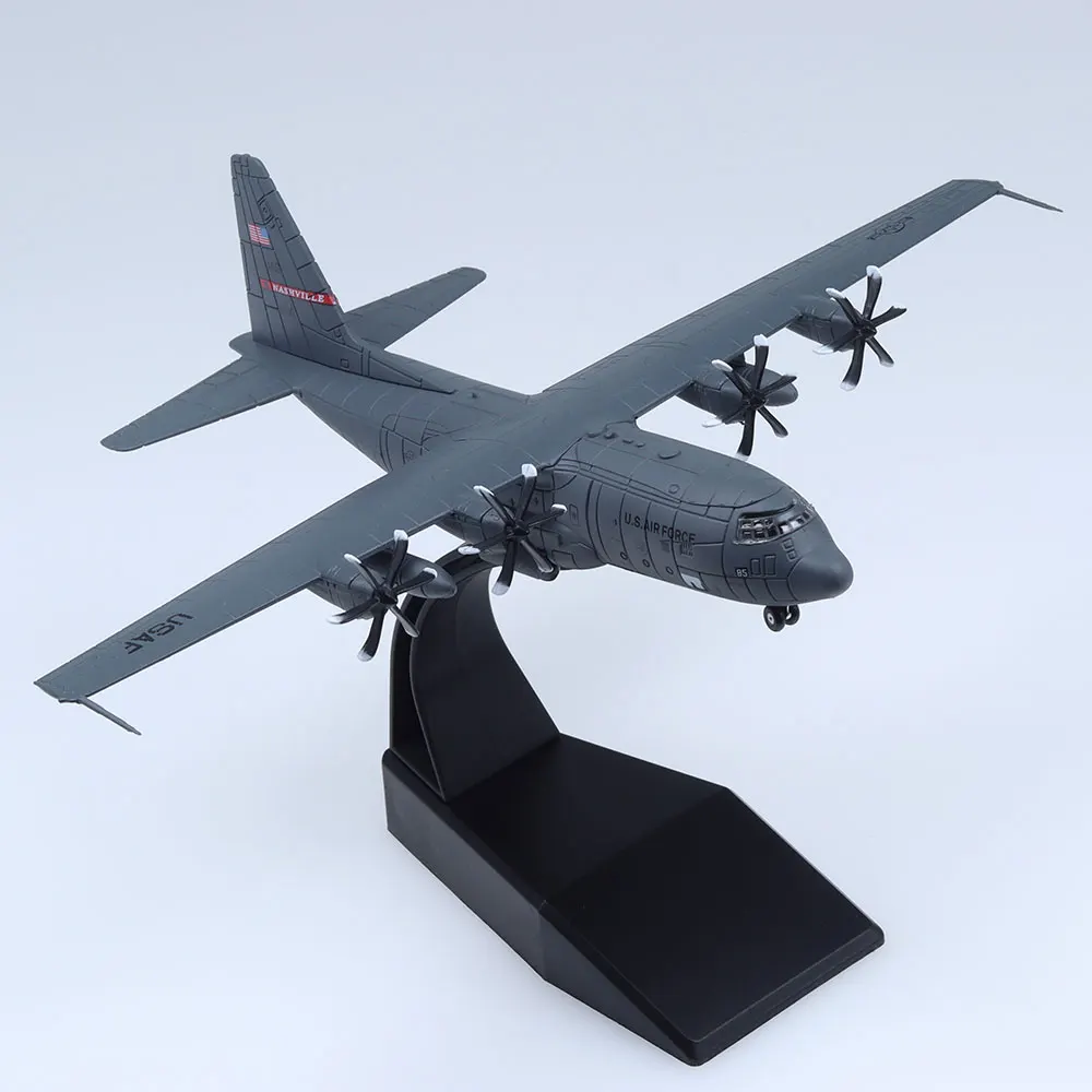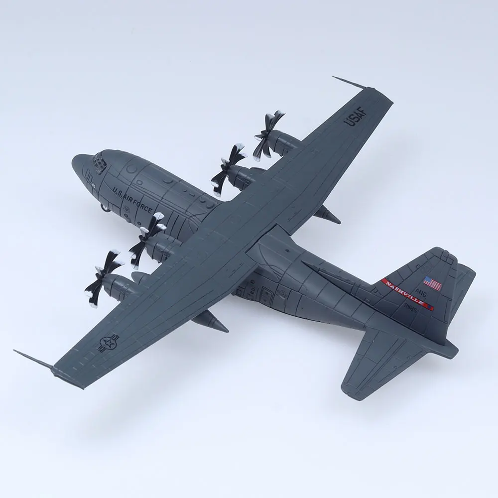 - The aircraft features a lifelike gray camouflage with detailed panel lines, meticulously reproducing the iconic C-130 Hercules aircraft.