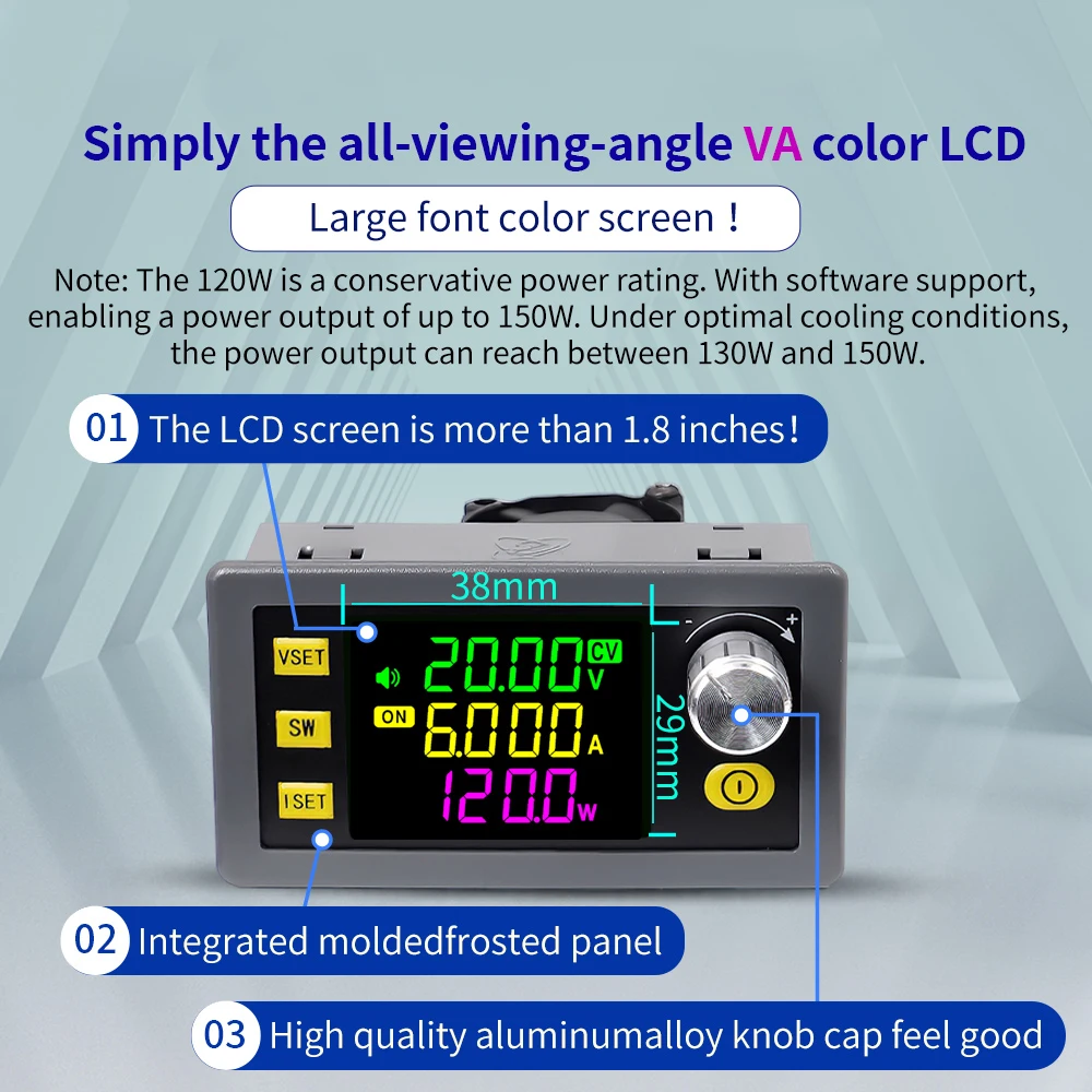 - Maximum output current of 6.000A, power of 120W, with adjustable over-current protection up to 6.2A and over-voltage protection up to 38V for safety and reliability.
