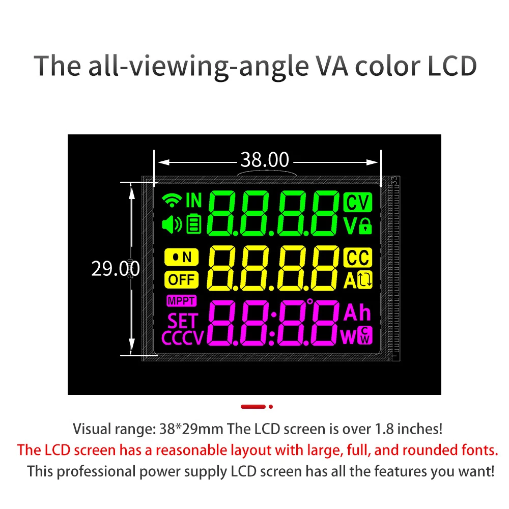 - Large, bright Color LCD screen with all-viewing-angle VA technology displays voltage (green), current (yellow), and power (purple) with high contrast for easy monitoring at a glance.