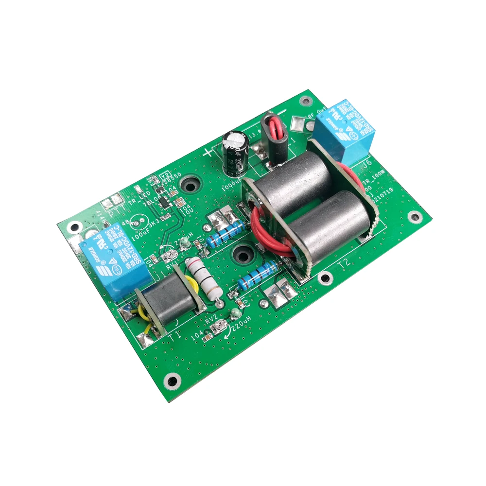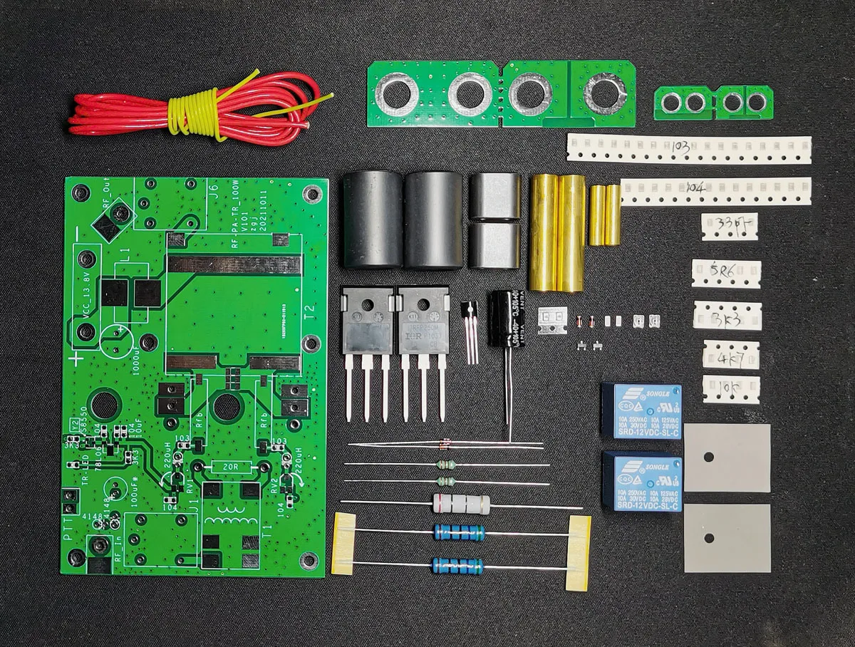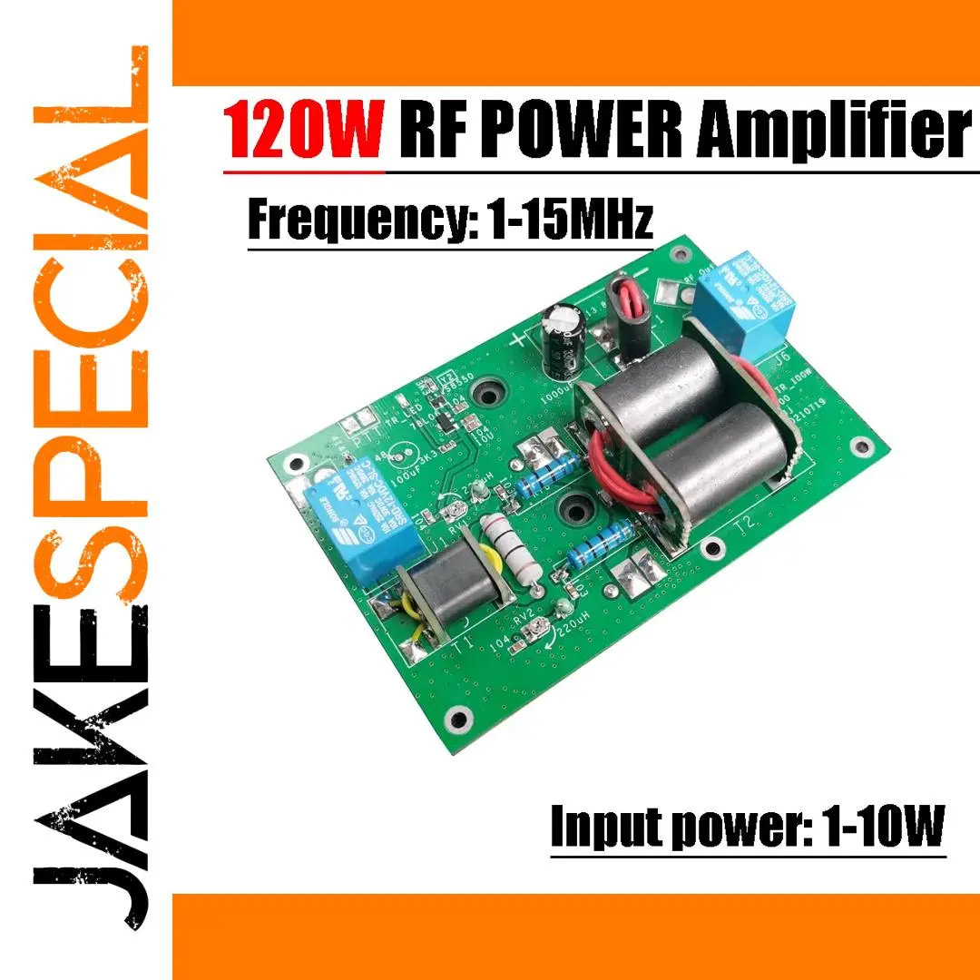 This compact 120W linear RF power amplifier, designed for high-frequency amateur radio use, operates across 1 MHz to 15 MHz, delivering 120W at 7 MHz and 100W at 14 MHz with an input of 1-10W. Its 12×8 cm green PCB features two large black cylindrical power transistors, a blue relay with white labels, and various resistors, capacitors, and small ICs, all mounted without connectors or a heatsink. Weighing just 150 grams, this automatic transceiver switch module is ideal for SSB, AM, CW, and HF applications, offering reliable high-power amplification in a sleek, technical design.