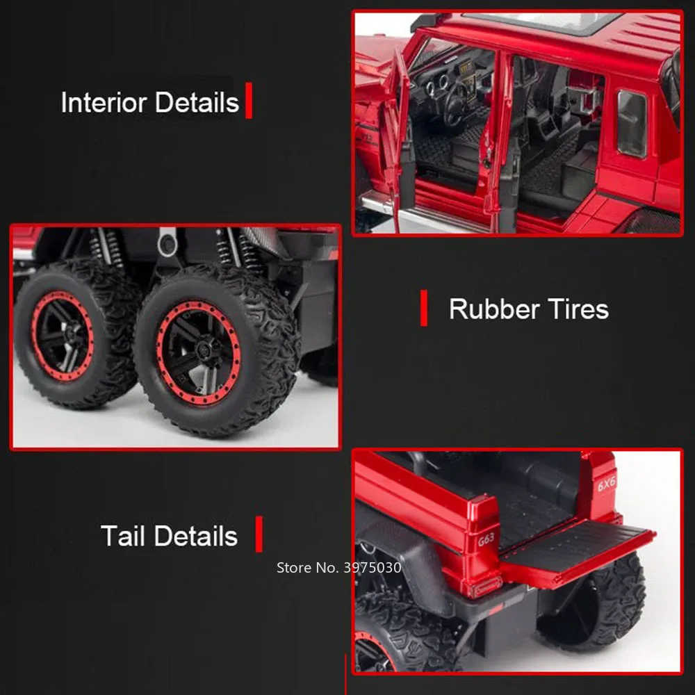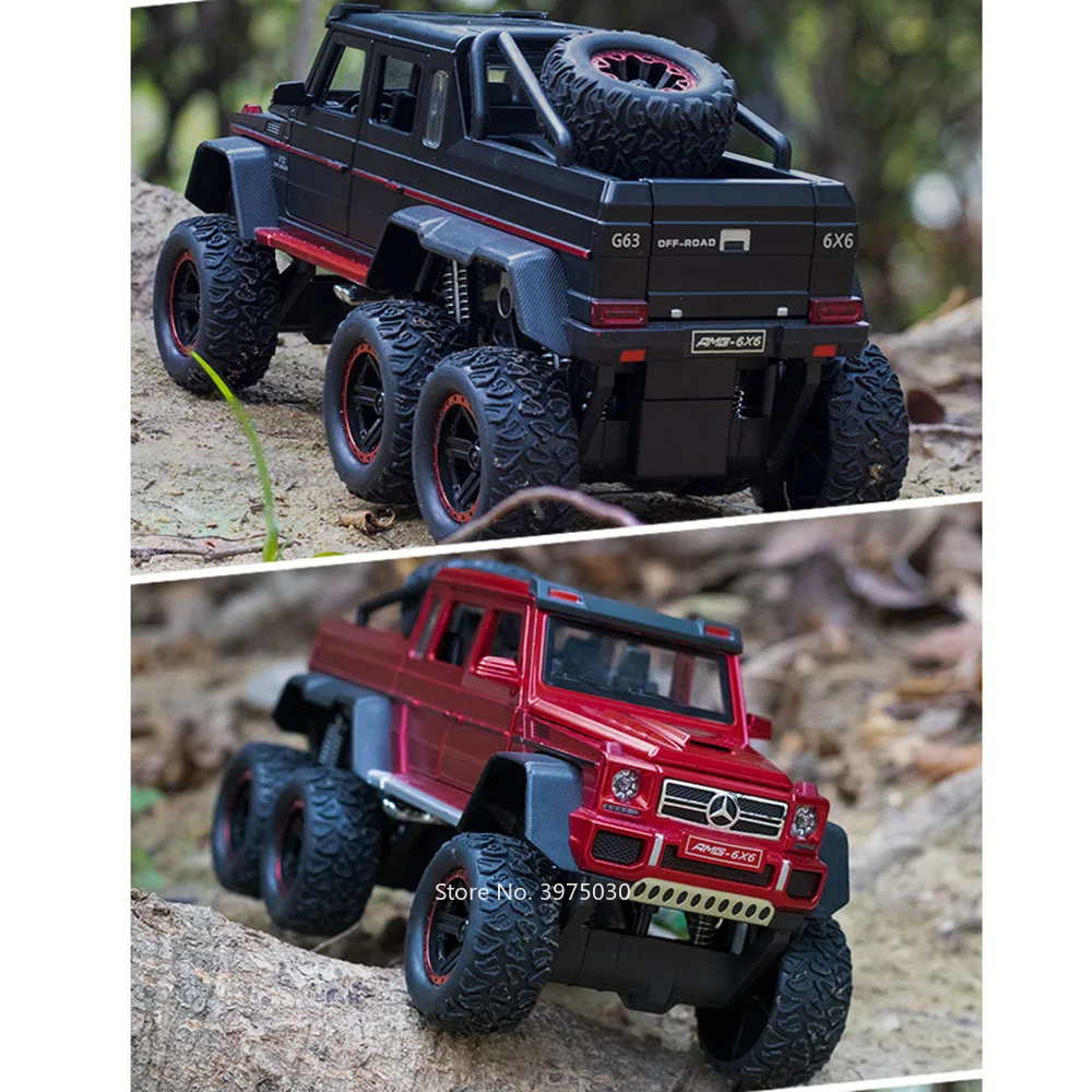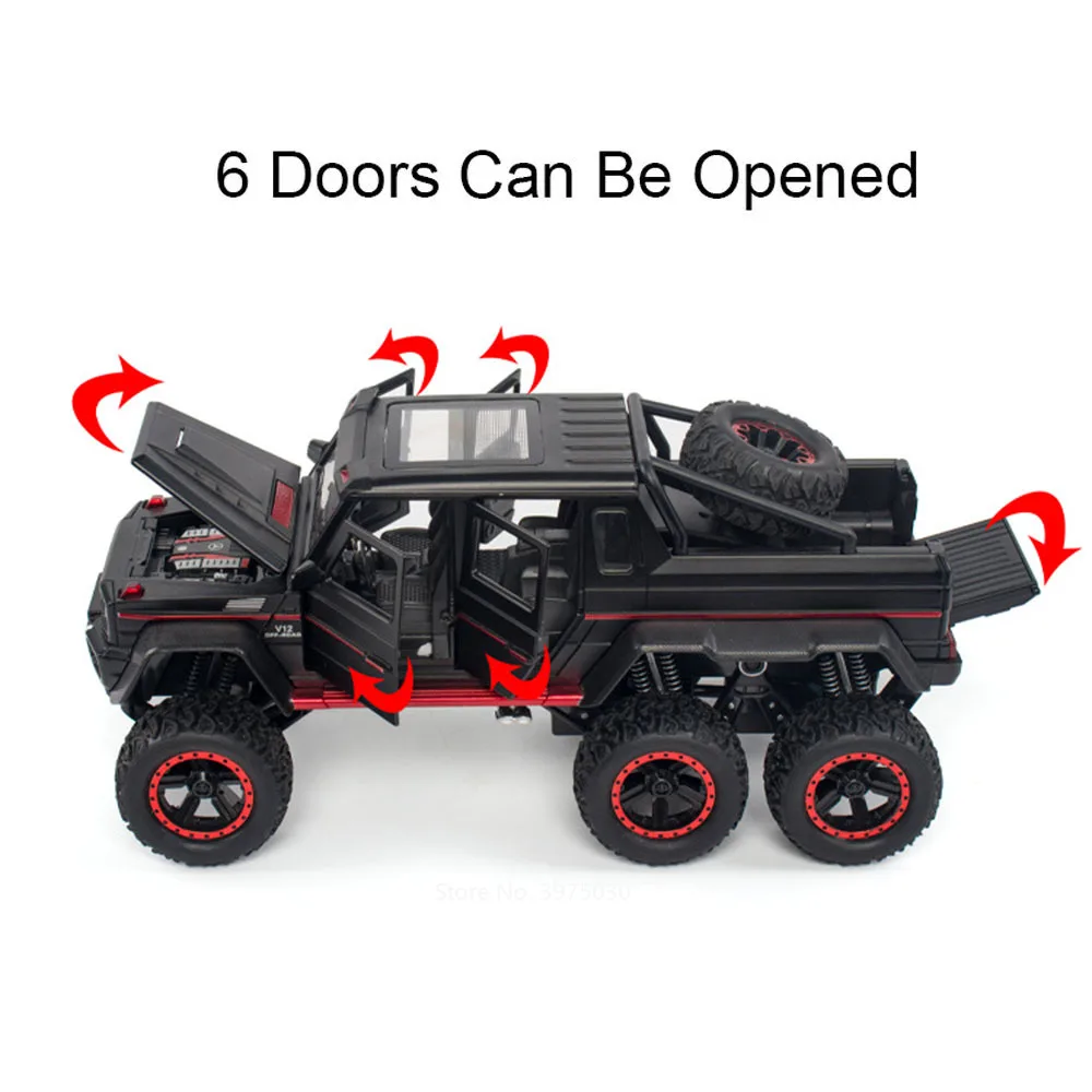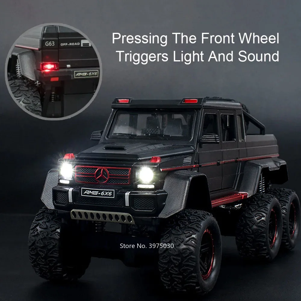 - High-detailed 1:22 scale diecast alloy construction enhances realism and durability, showcasing a precise imitation of the legendary Mercedes-Benz G63 6X6 with professional craftsmanship.