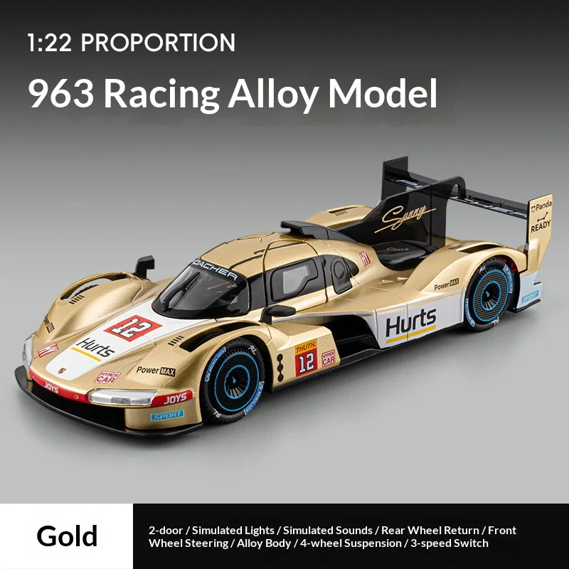 Experience the thrill of high-speed racing with this highly detailed 1:22 scale diecast Porsche 963 model, crafted with meticulous precision. Perfect for collectors and enthusiasts, this stunning replica features vibrant body colors—either striking red with black accents or elegant gold—highlighting bold racing decals, sponsor logos, and the iconic number 6. The aerodynamic body, curved headlights, and rear wing spoiler in black add dynamic realism. Made from durable metal, it boasts sound and light functions that enhance your viewing experience. Whether displayed or used for passionate collection, this model captures the essence of racing excitement and craftsmanship, making it a compelling addition to any automotive collection.