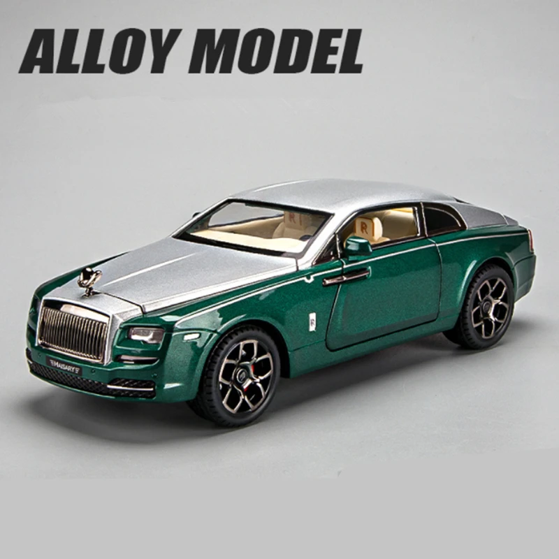 Experience the luxury and craftsmanship of the 1:22 scale diecast alloy model of the Rolls-Royce Wraith, expertly crafted from metal and plastic with a sleek dark green finish accented by a silver roof and hood. The model features a detailed interior with realistic cream-colored seats and orange accents, complemented by black multi-spoke rims and textured tires. Front headlights are intricately designed with clear covers, and the model boasts sound and light functions for added realism, all without requiring a battery. Perfect for collectors or as a refined gift, this high-quality piece is suitable for ages 4 and up, embodying elegance, precision, and timeless style.