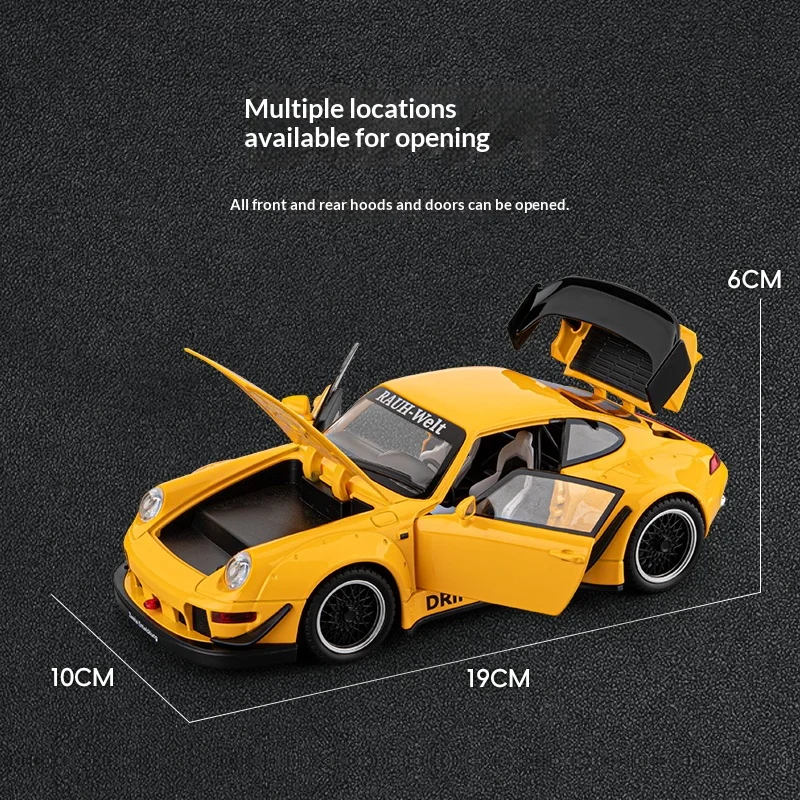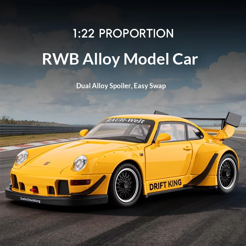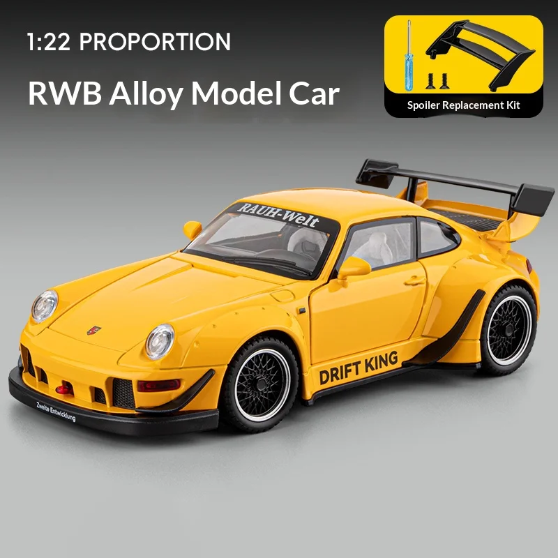 Imagine owning this stunning 1:22 scale RWB alloy sports car, expertly crafted with vibrant yellow paint and realistic racing details. Its sleek, aerodynamic design features smooth curves and a low profile, perfectly capturing the spirit of high-speed racing. The black accents, including a prominent front splitter, side skirts, and air vents, add to its aggressive stance. The large black alloy spoiler on the trunk enhances its sporty look, while the detailed multi-spoke wheels with low-profile tires imply speed and performance. The metallic finish gives it a shiny, reflective surface, and the clear windows reveal intricate interior details like the steering wheel and seat contours. This model is perfect for collectors or car enthusiasts who appreciate high-quality craftsmanship and realistic aesthetics.