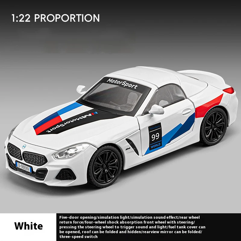 Experience the thrill of owning a stunning 1:22 scale BMW Z4 model. This detailed car is crafted from a robust metal alloy using die-cast construction, featuring an eye-catching predominantly white body adorned with vibrant racing-themed graphics in blue, red, and black. With intricate details like a diamond-patterned grille and sporty black wheels, this model captures the essence of the Z4 beautifully. The convertible design enhances its playability, while the transparent windshield reveals the meticulously crafted interior. Plus, enjoy the immersive simulation sound and light effects powered by a convenient button battery, making this a fantastic collectible or gift for car enthusiasts.