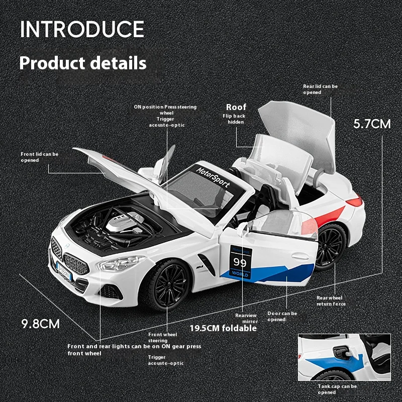 With its striking design and captivating features, this BMW Z4 model not only serves as a stunning decorative piece but also as an interactive toy that sparks joy. Picture yourself enhancing your display with this eye-catching model or gifting it to a fellow car enthusiast who will treasure it. Don't miss out on the opportunity to own this remarkable piece of automotive art!