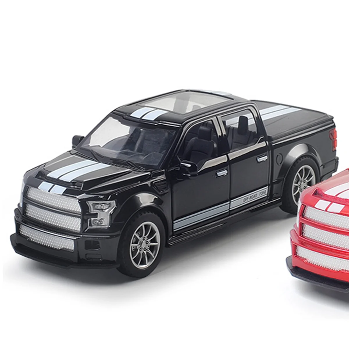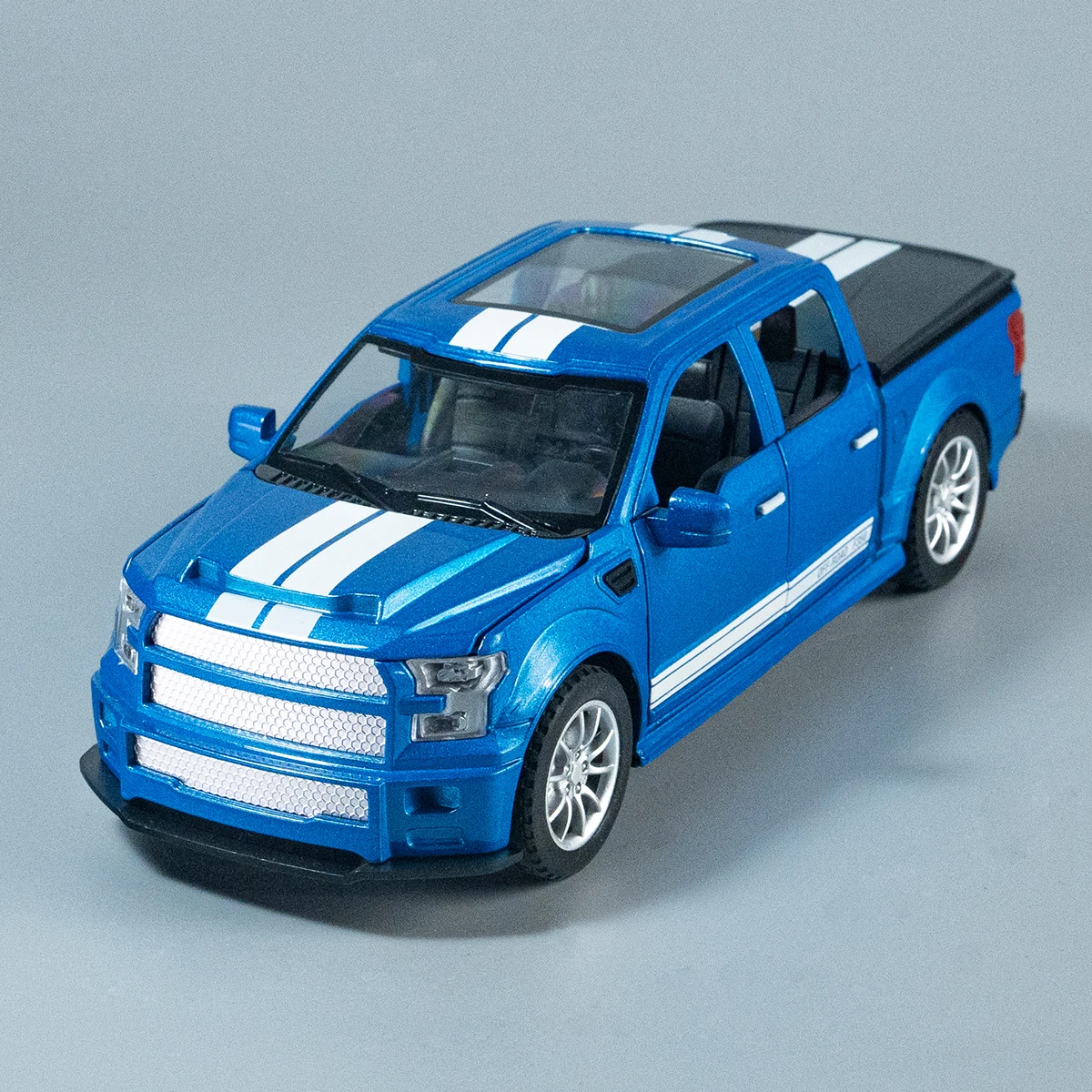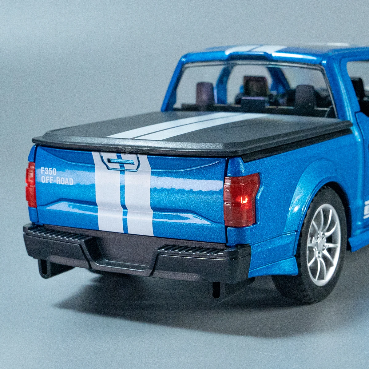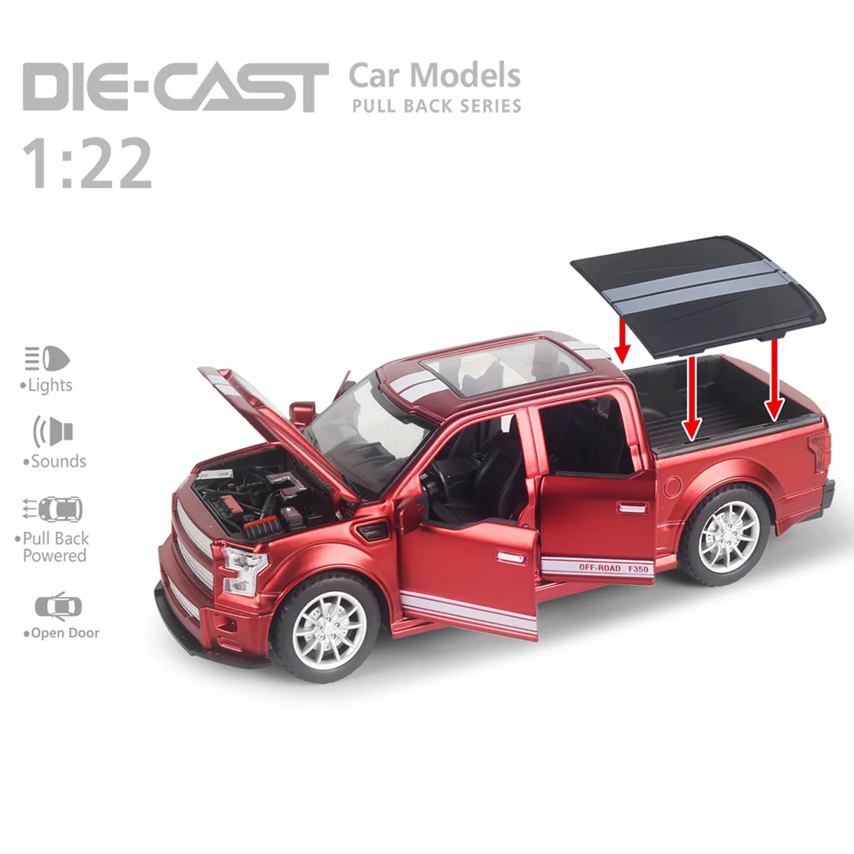 Experience the realism of this 1:22 scale diecast model pickup truck, crafted from high-quality alloy with a glossy finish available in black, blue, and red. This detailed collectible features textured grille patterns, illuminated headlights, alloy-style rims with intricate rims and low-profile tires, and functional opening doors and tailgate revealing a lifelike interior. No batteries are needed, making it durable for display or collection. Perfect for collectors, hobbyists, or enthusiasts seeking a sophisticated miniature vehicle, this non-electric model combines craftsmanship and realism in a compact size, measuring approximately 1-3 cm with slight manual measurement variance.