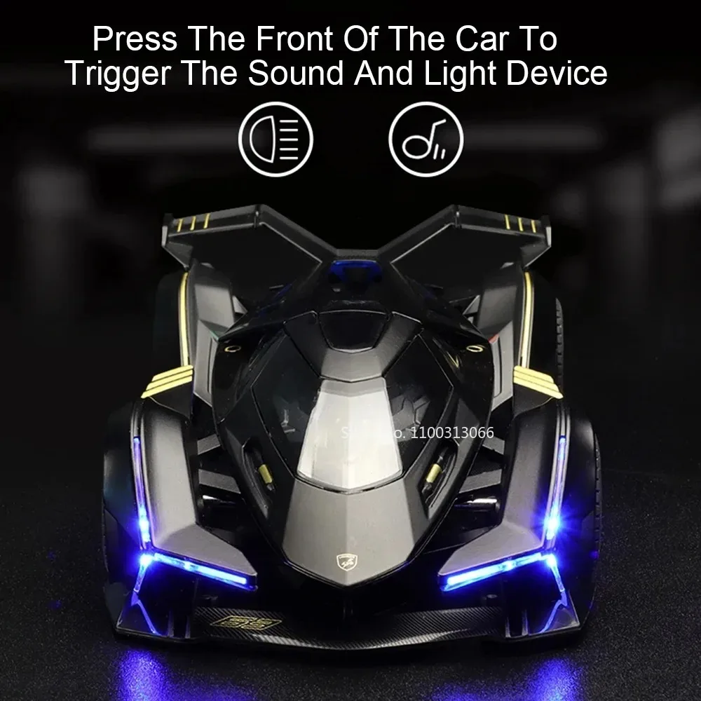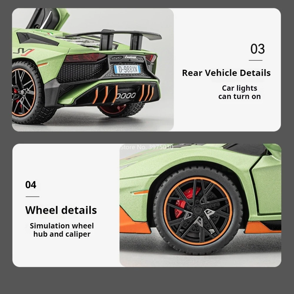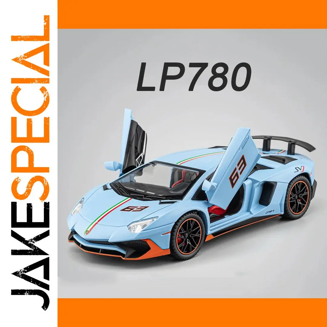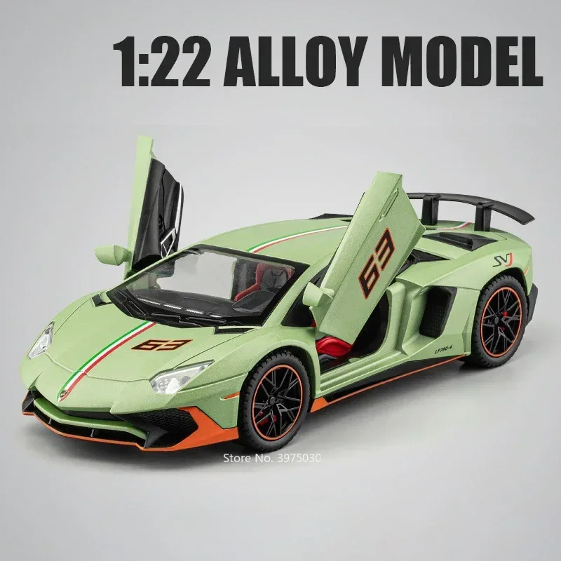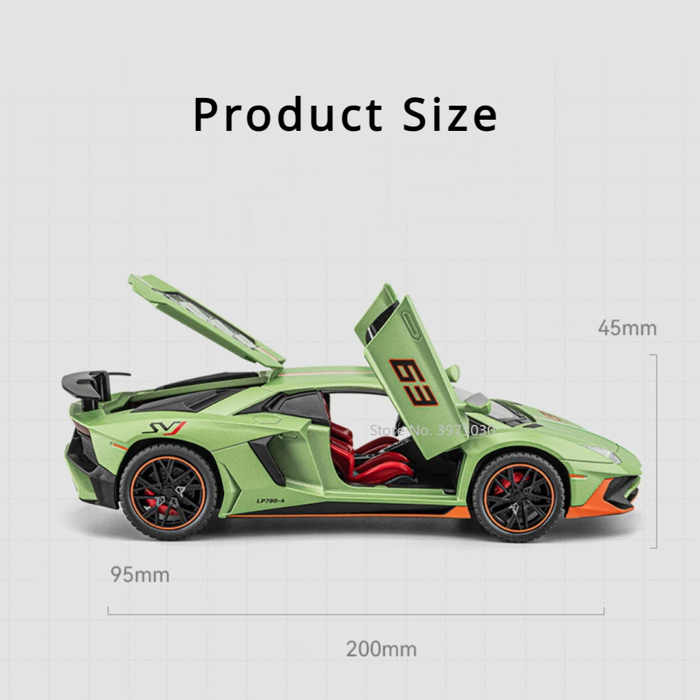 Experience the thrill of owning a high-quality, detailed replica of the iconic Lamborghini LP780 V12 GT with this impressive 1:22 scale model. Crafted with meticulous care, this miniature boasts a metallic zinc alloy body that provides strength and durability, complemented by a plastic chassis and durable rubber tires. Its aerodynamic design features sharp angles and a low profile, capturing the aggressive and sporty essence of the real car. Available in vibrant colors such as blue, green, grey, and black, each model is finished with a glossy, metallic sheen for maximum realism. Functional doors open upward in classic scissor style, revealing intricate interior details. Advanced features like sound, light effects, and pull-back mobility make this collectible both visually stunning and interactive.