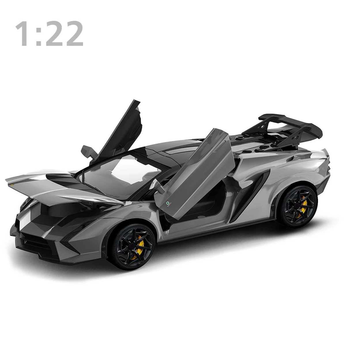 Imagine elevating your collection with this meticulously crafted diecast model of a luxury supercar, scaled at 1:22 for perfect display. Finished in striking metallic silver with black accents, it captures the sleek, aerodynamic shape of an elite sports car. The model showcases sharp angular lines, a low profile, and a pointed nose, embodying racing-inspired elegance. The gullwing or scissor doors open upward, revealing a detailed interior that hints at high-end craftsmanship. Sporting a rear spoiler and black wheels with eye-catching yellow brake calipers, it exudes high-performance style. Made from sturdy metal, this model boasts remarkable realism and durability, making it an ideal collectible ornament or toy for enthusiasts who cherish precision and aesthetic harmony.