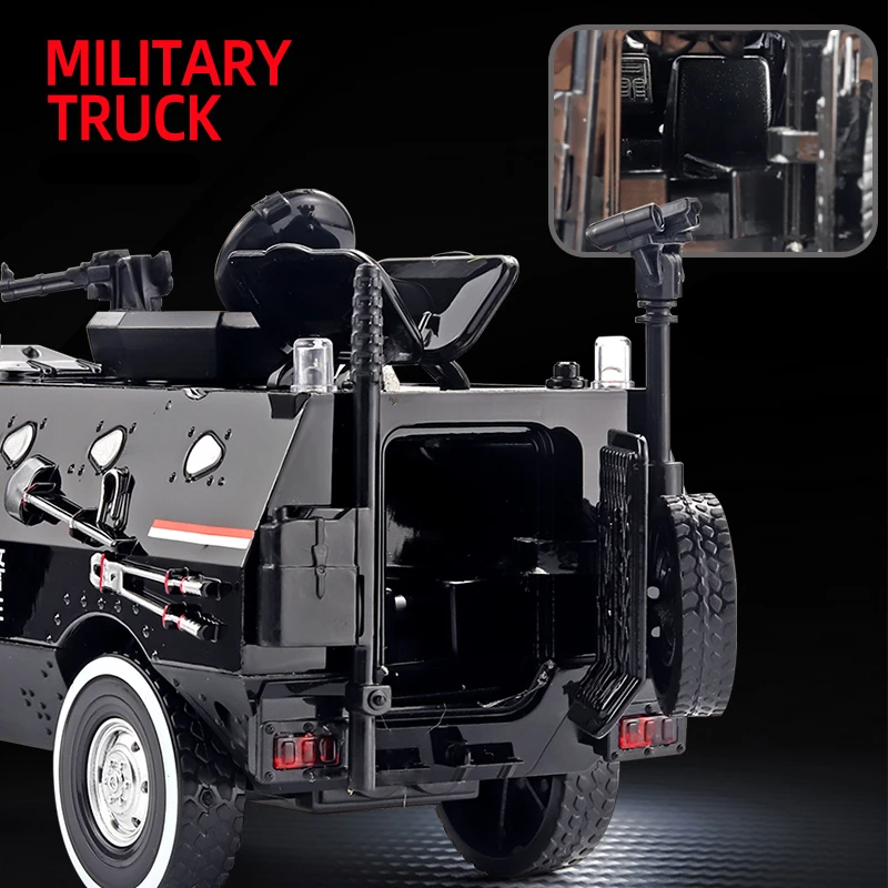 - Features realistic molded details such as armored panels, storage compartments, and a turret with a scope and binoculars, capturing the essence of a tactical military vehicle.