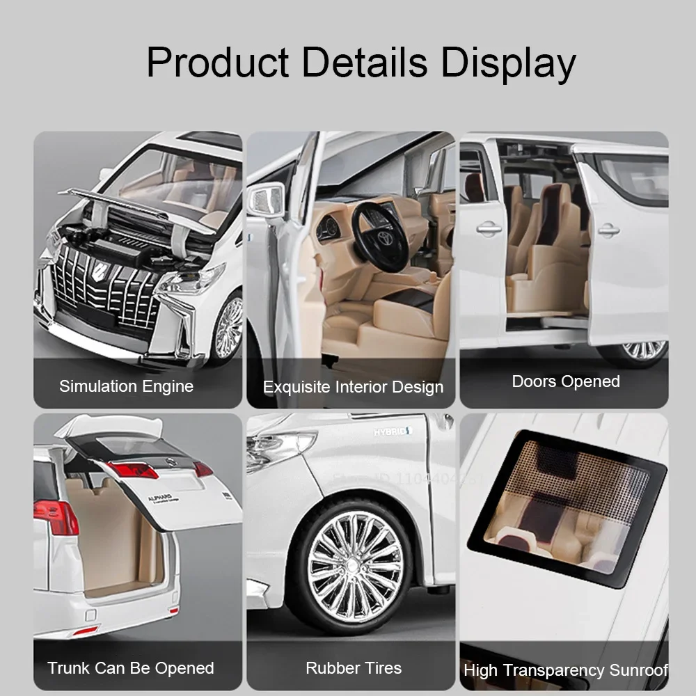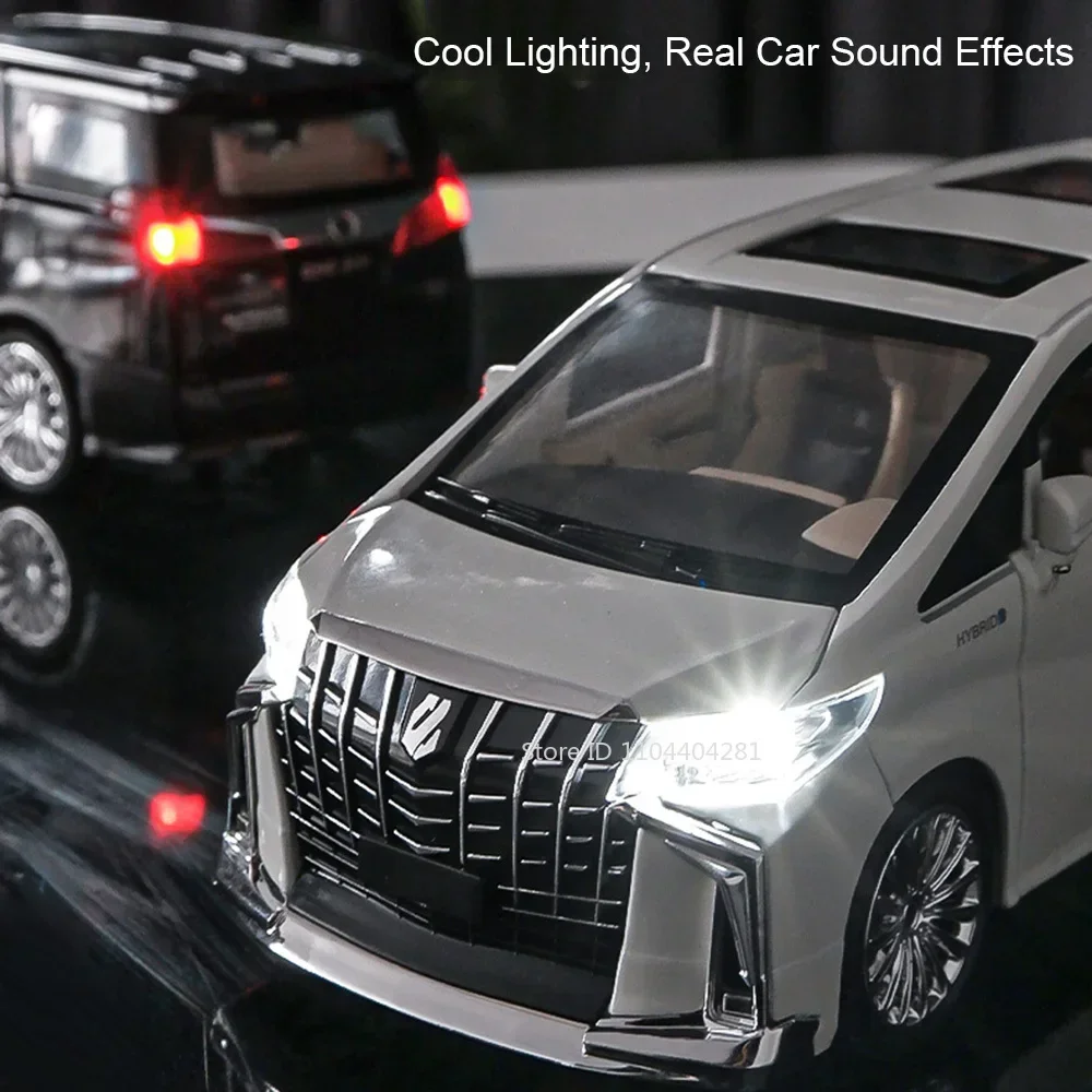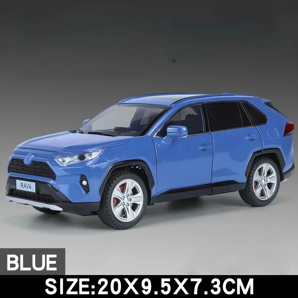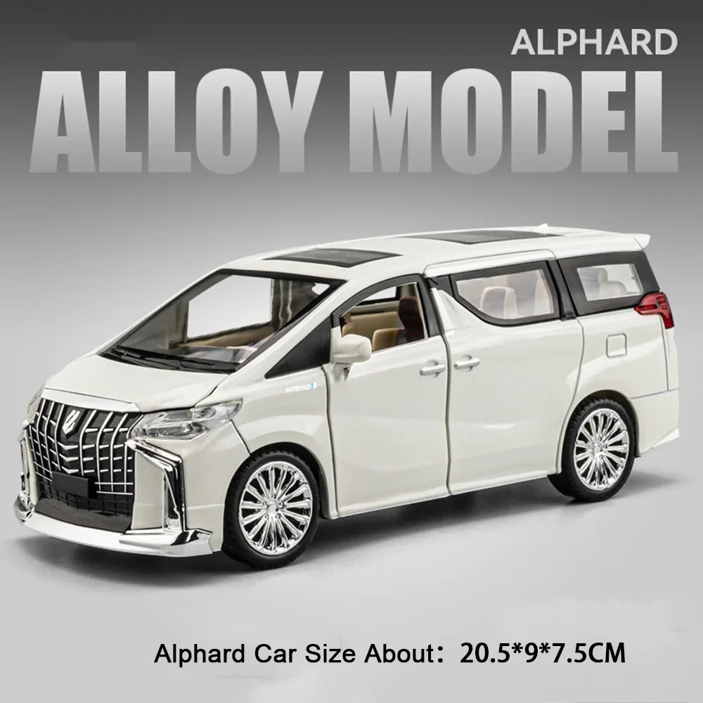 Experience the realistic charm of this 1:24 scale diecast alloy car model, available in black and white Alphard or red, white, and blue RAV4. Crafted with a durable metal body, plastic chassis, and rubber tires, measuring approximately 20.5 x 9 x 7.5 cm (Alphard) or 20 x 9 x 7 cm (RAV4), it features openable doors, pull-back functionality, and built-in sound and light effects with included batteries. The sleek design with detailed exterior accents, sharp headlamps, multi-spoke alloy wheels, and a panoramic sunroof makes it a perfect collectible, gift, or display piece that exudes modern sophistication and craftsmanship.
