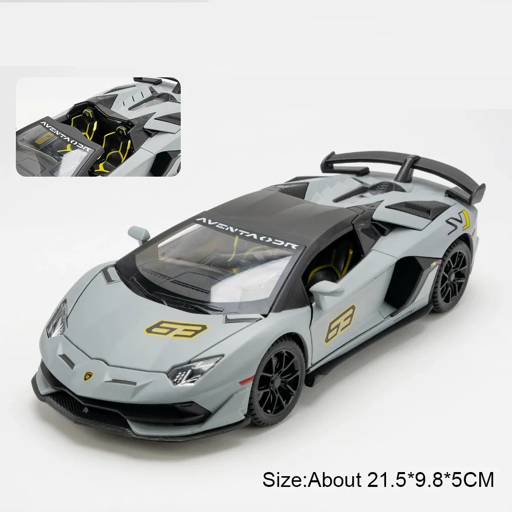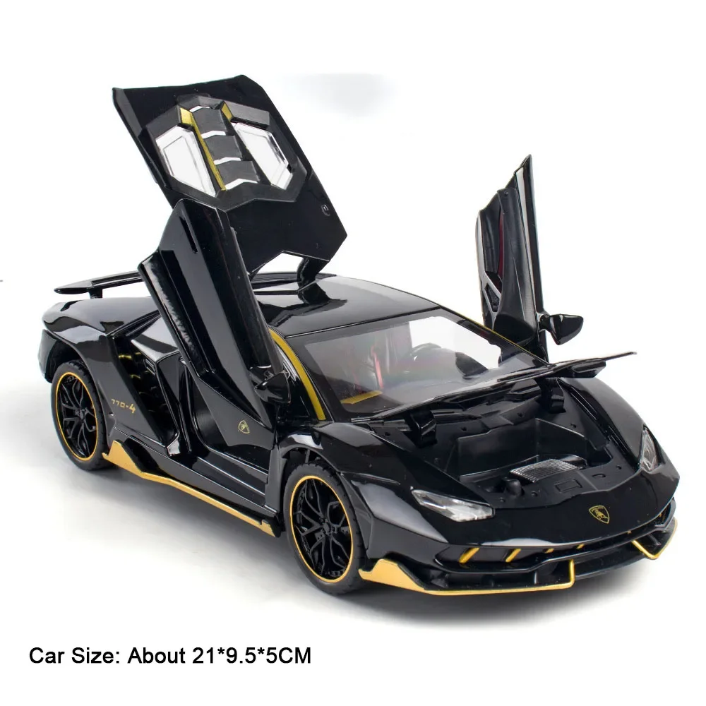 Experience the thrill of luxury with this 1:24 alloy diecast car model featuring a sleek metal body, plastic chassis, and rubber tires available in vibrant colors including yellow, red, green, grey, and black. The LP770 model measures approximately 21 x 9.5 x 5 cm, while the SVJ63 model is about 21.5 x 9.8 x 5 cm. Crafted for durability, it includes opening doors, pull-back motion, and built-in sound and light effects powered by batteries. Perfect for collectors, enthusiasts, or as a striking gift, this high-simulation model brings a realistic and premium automotive experience to your collection.
