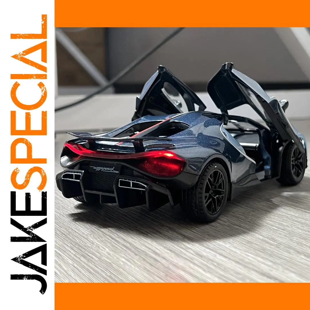 Immerse yourself in the thrill of high-performance with this 1:24 scale diecast alloy supercar model, featuring a sleek, aerodynamic design finished in metallic dark gray, black, blue, or gold. This detailed collectible boasts illuminated red taillights, a rear spoiler, venting, and multi-spoke alloy wheels with textured tires, capturing the essence of luxury and sportiness. Equipped with sound and light functions powered by button batteries, it offers an interactive display that enhances its realism. Crafted from durable alloy metal, this model is perfect for display, collection, or as a sophisticated gift for adult enthusiasts, combining precision craftsmanship with modern aesthetics.