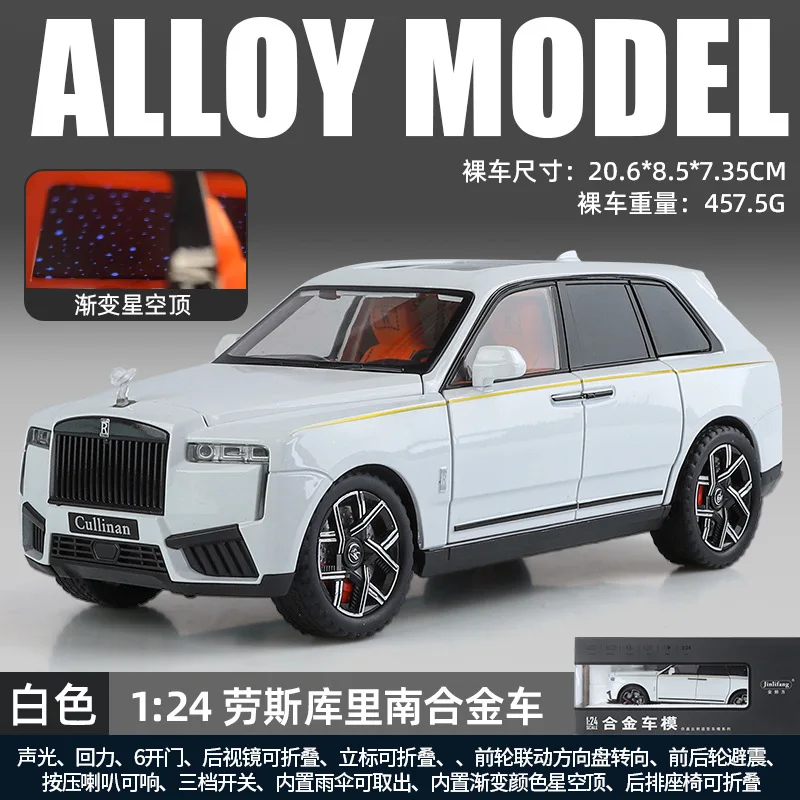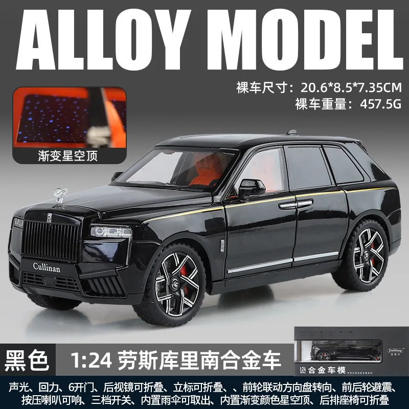 Experience the luxury and craftsmanship of this large diecast Rolls Royce Cullinan alloy car model. Perfect for enthusiasts and collectors, this meticulously detailed replica combines realistic design with interactive features. Its sturdy alloy shell and intricate interior details create a premium feel, making it an eye-catching decorative piece. With sound and light effects activated by a simple button, you can enjoy an immersive display that enhances any space. The model’s six-door design and precise scale offer a fantastic representation of the original vehicle. Whether as a gift or display piece, this model captures the essence of elegance, craftsmanship, and innovation, bringing a touch of automotive luxury into your collection.