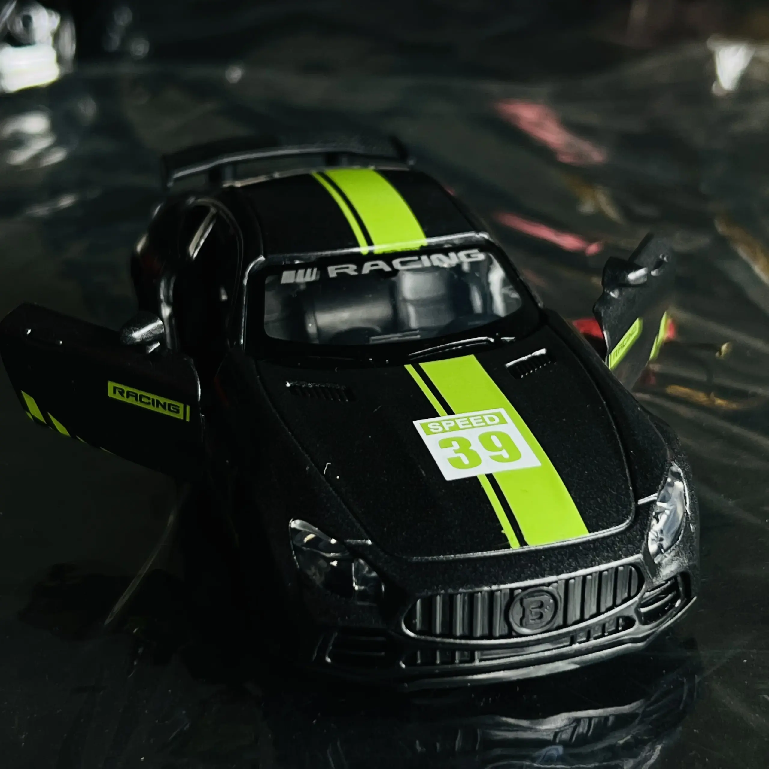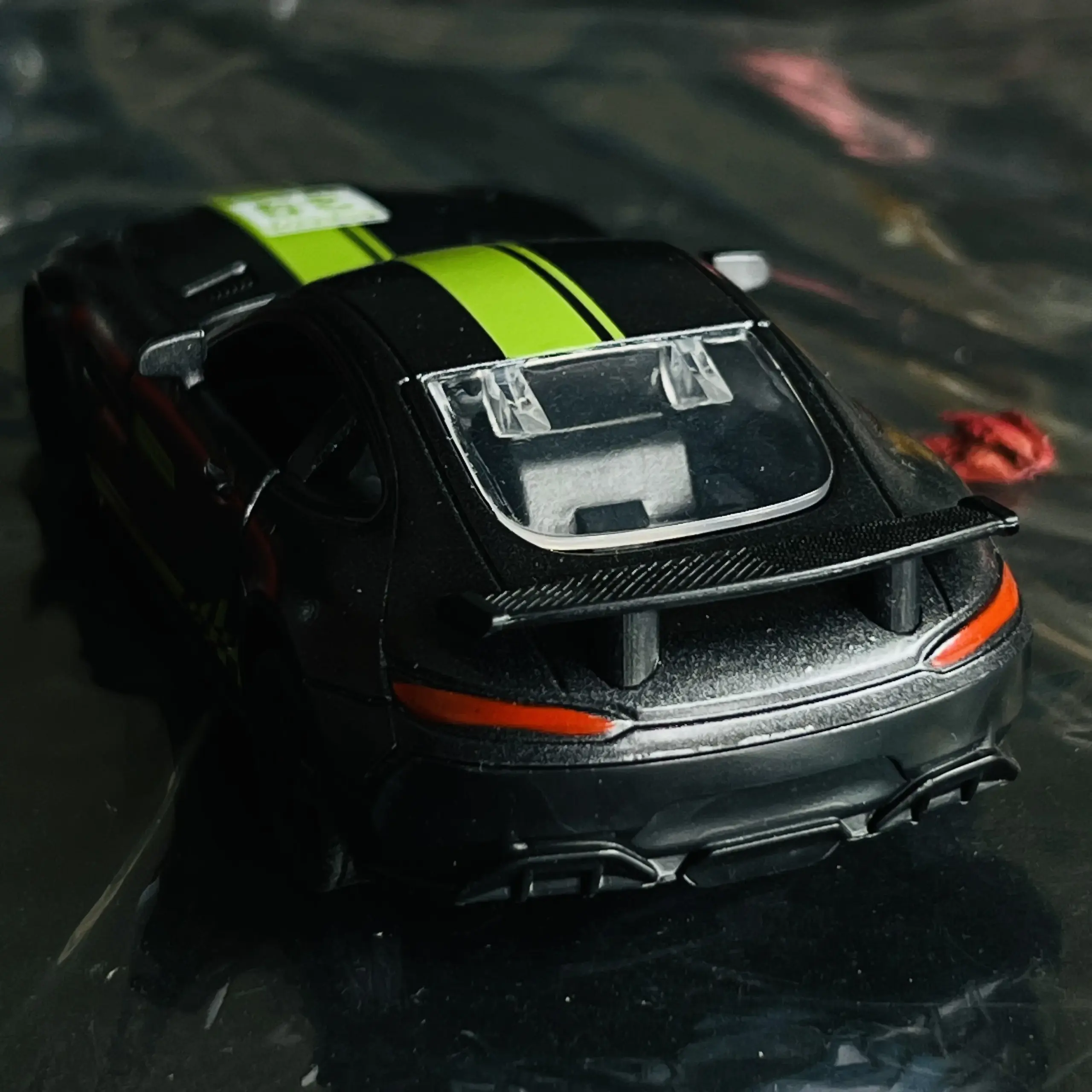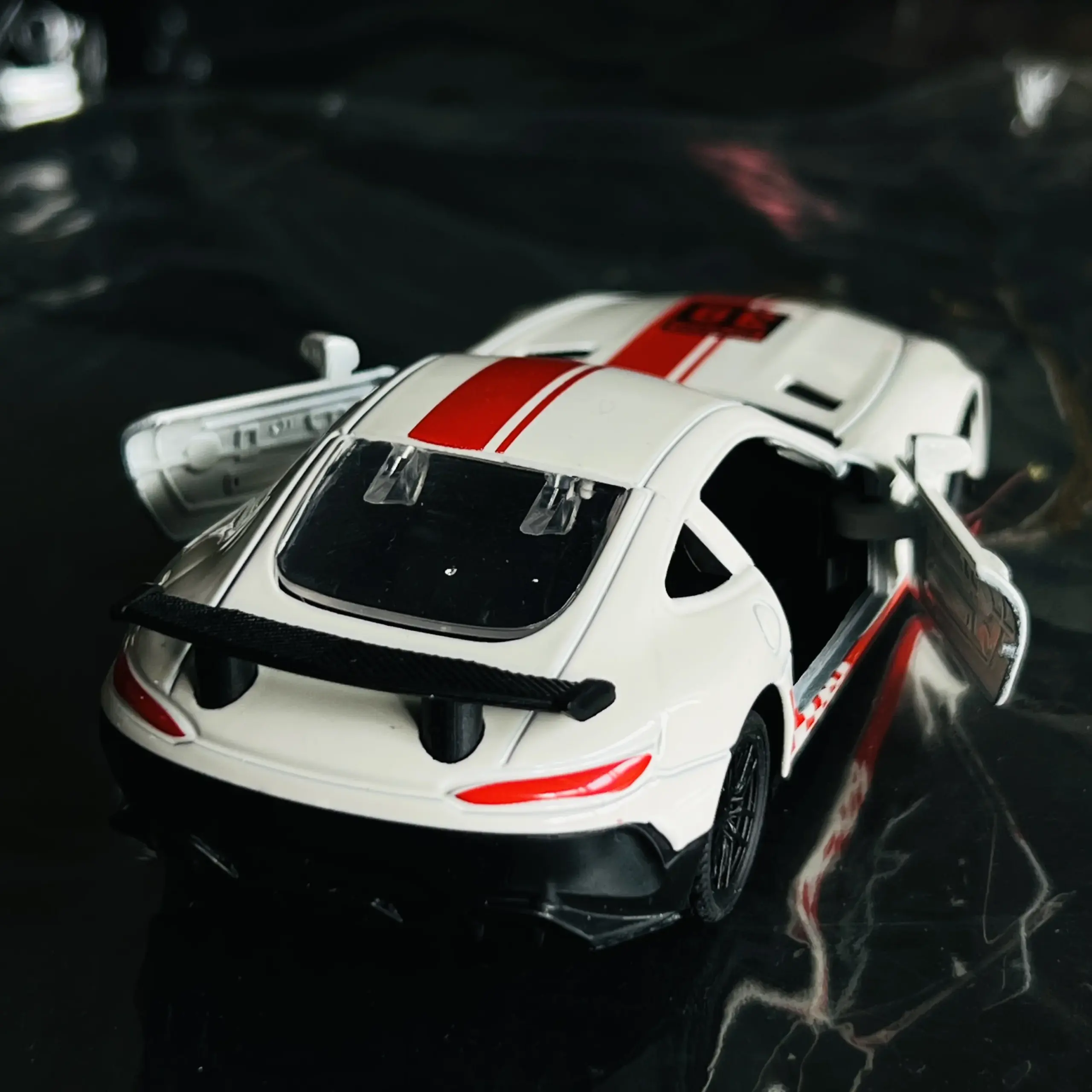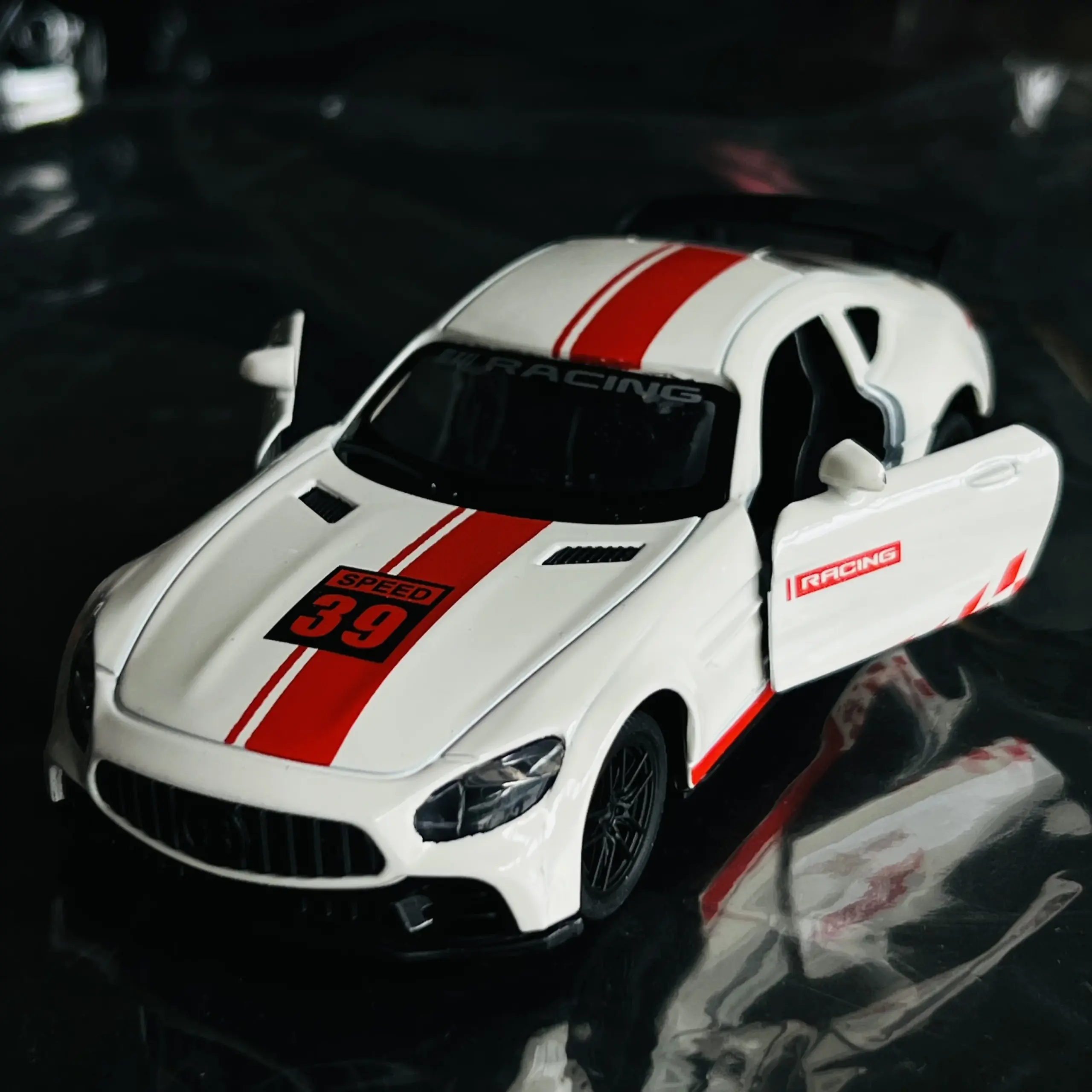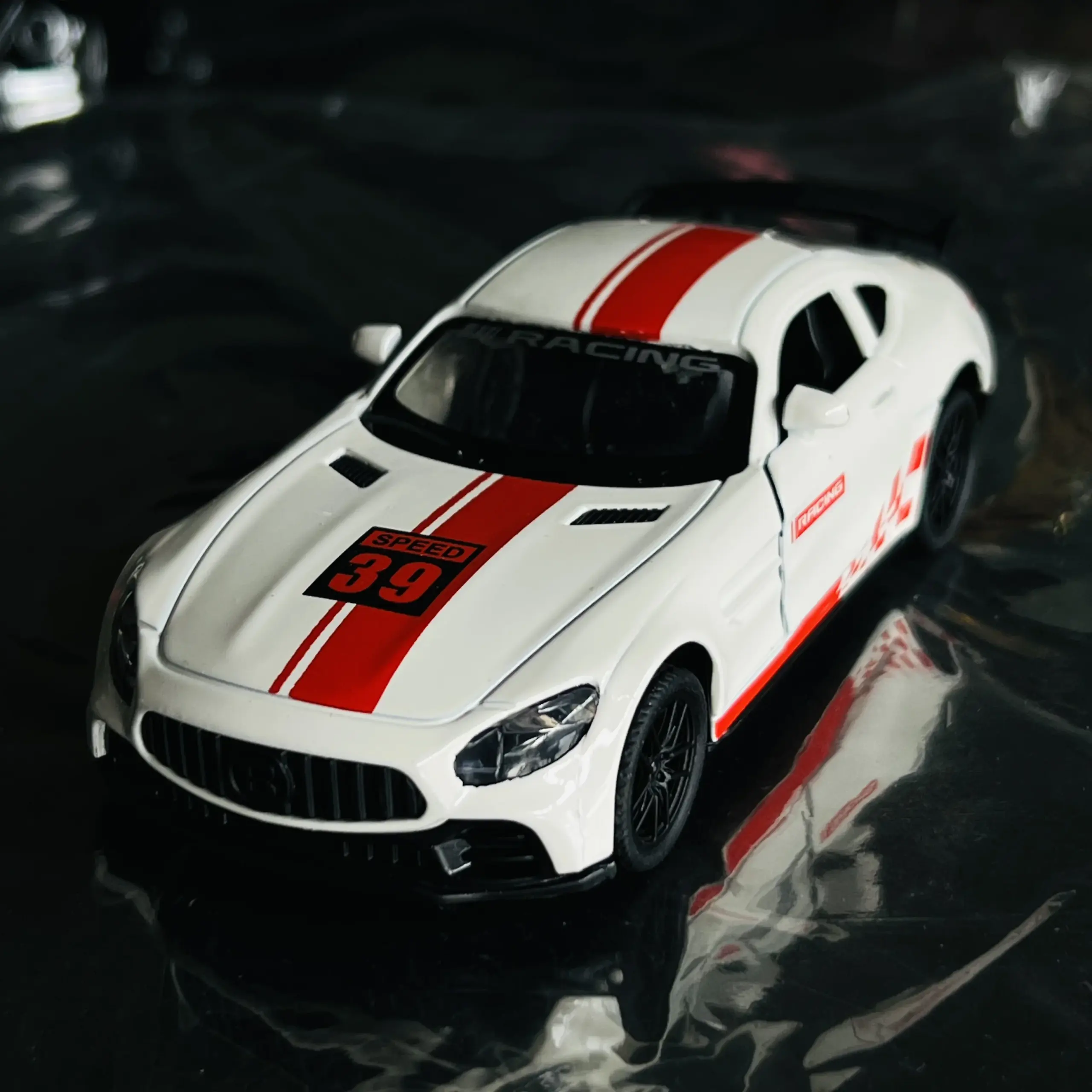 - Features bold red stripes on the hood and roof, complemented by realistic headlights and side mirrors for authenticity.
