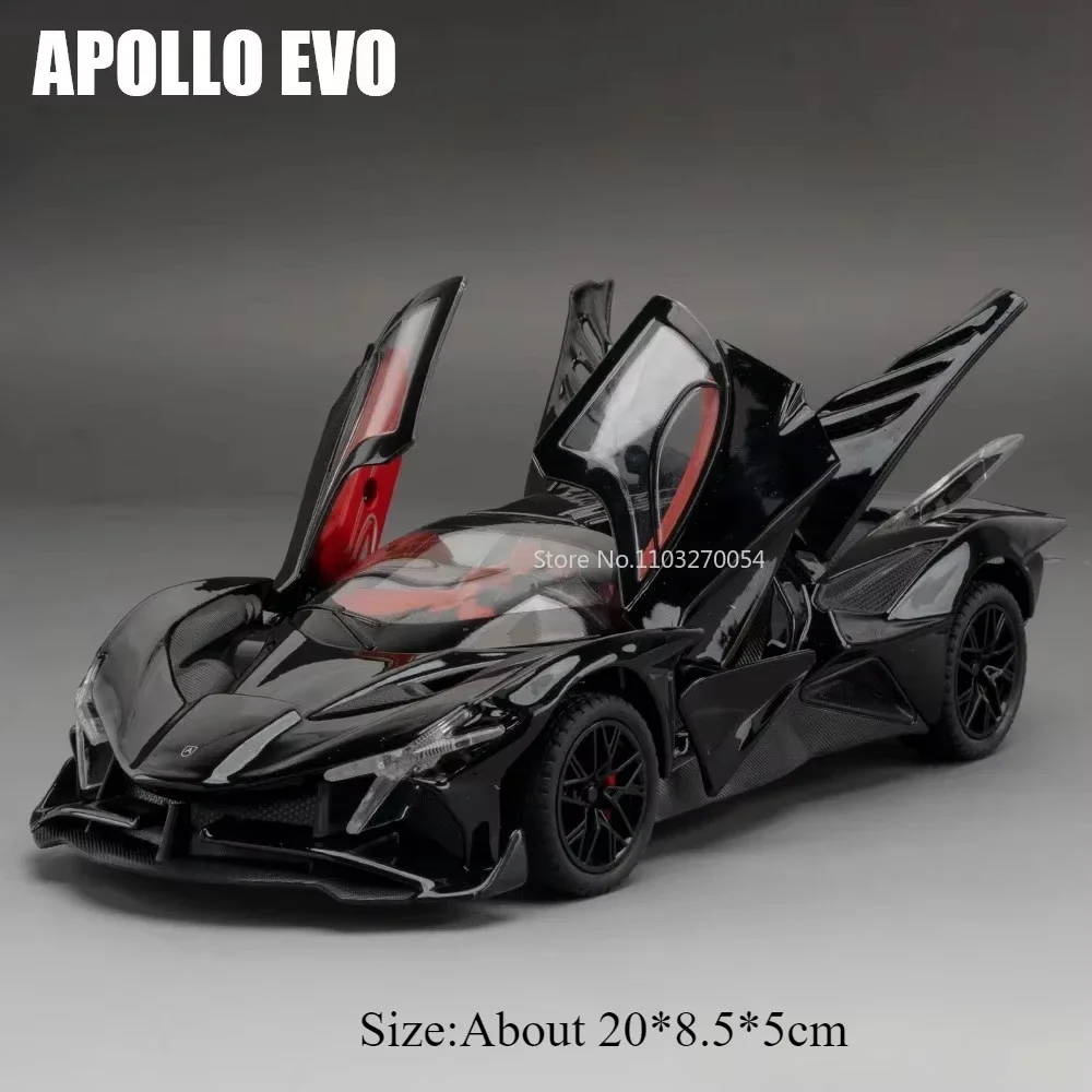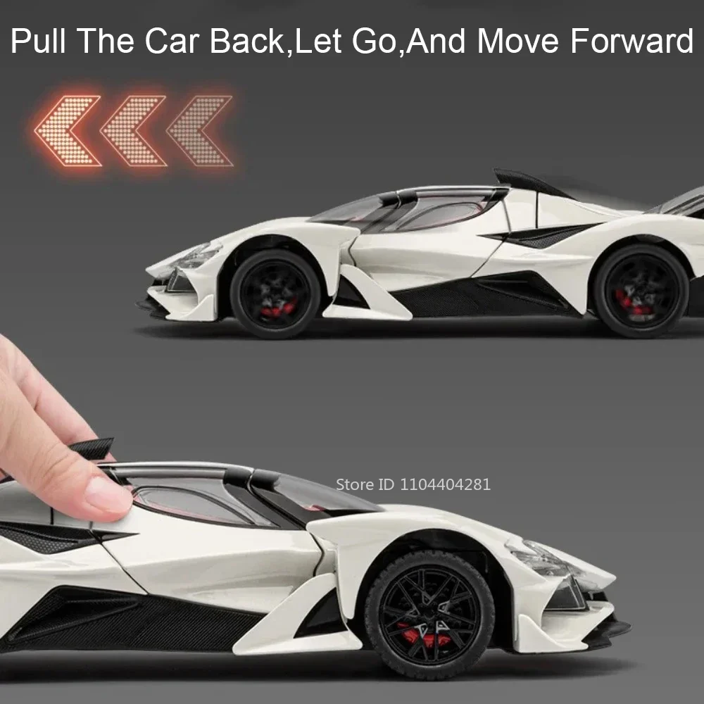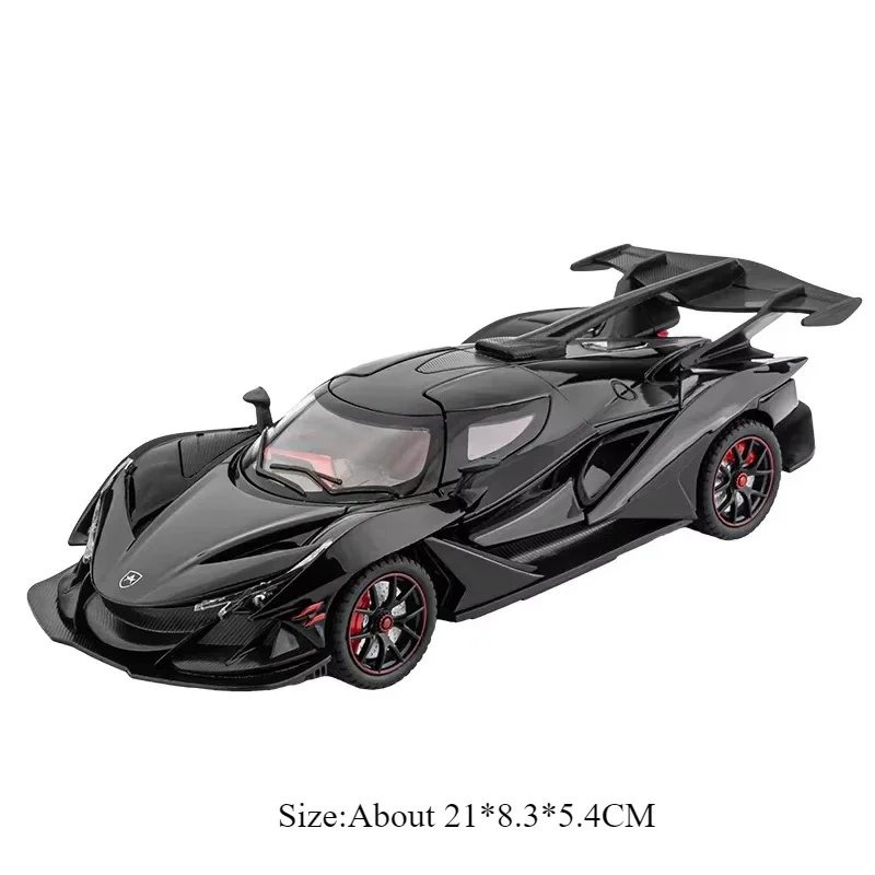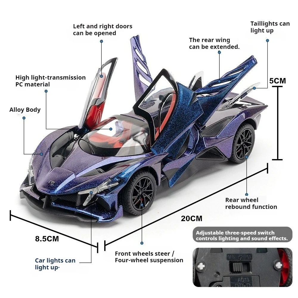This 1:24 scale alloy sports car model features a durable metal body, plastic chassis, and rubber tires, measuring approximately 20 x 8.5 x 5 cm for the EVO version and 21 x 8.3 x 5.4 cm for the IE version. It boasts functional doors that open upward, integrated LED lights, and sound effects powered by included batteries. The sleek, aerodynamic design is accentuated by sharp angular lines, vent-like details, and a captivating iridescent purple finish that reflects light beautifully. Available in multiple vibrant colors—purple, orange, black, white, and red—this high-simulation model captures the speed, luxury, and modern technological appeal perfect for collectors and enthusiasts aged 14 and above.